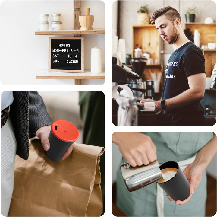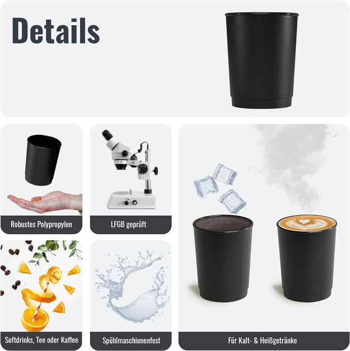 - Sowohl die Coffee-to-go-Becher, als auch die Deckel bestehen aus recycle fähigem, hochwertigem, geschmacksneutralem Polypropylen (PP) – lebensmittelecht, frei von Weichmachern und LFGB geprüft. Unsere Kaffee-Mehrweg-Becher sind spühlmaschienenfest,