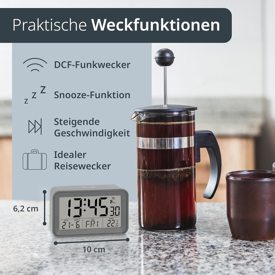 - Zuverlässiger DCF-Funkwecker ohne Ticken: Mit Snooze-Funktion für die "fünf Minuten mehr" und schneller werdendem Alarmton, der dich sanft und dennoch effektiv aufweckt. Kein abruptes Klingeln mehr