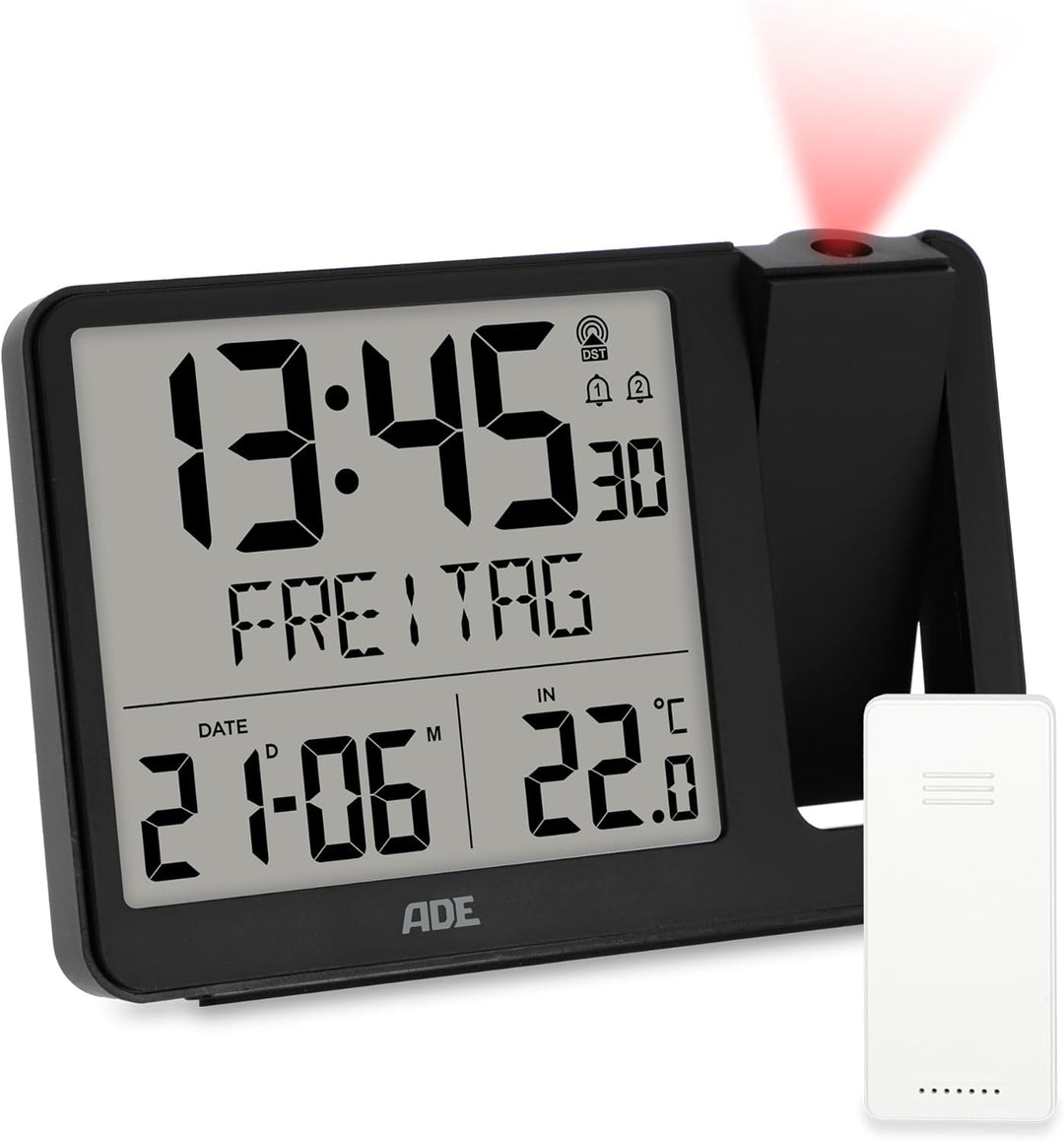 - Projektionswecker mit Aussensensor: Klare Projektion der Uhrzeit und Temperatur (innen oder aussen) an die Decke oder Wand. Der Projektionsarm ist schwenkbar und die Projektion um 180° drehbar. Inklusive Aussensensor