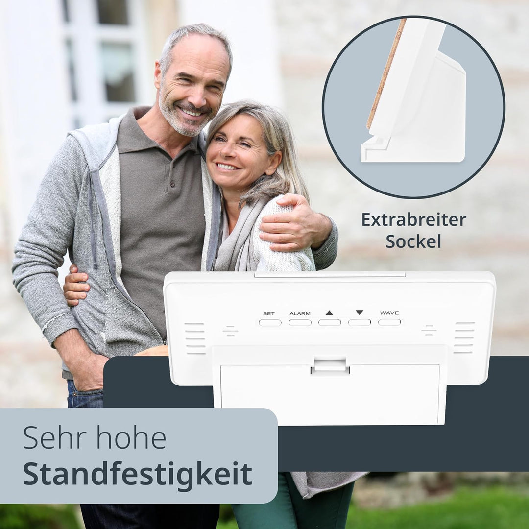- Grosse Snooze- und Lichttaste: Einmal auf die grosse Taste der Tischuhr drücken aktiviert die Snooze-Funktion (5 Min.) bzw. die optionale Beleuchtung (5 Sek.). Das spart Strom und stört den Schlaf nicht
