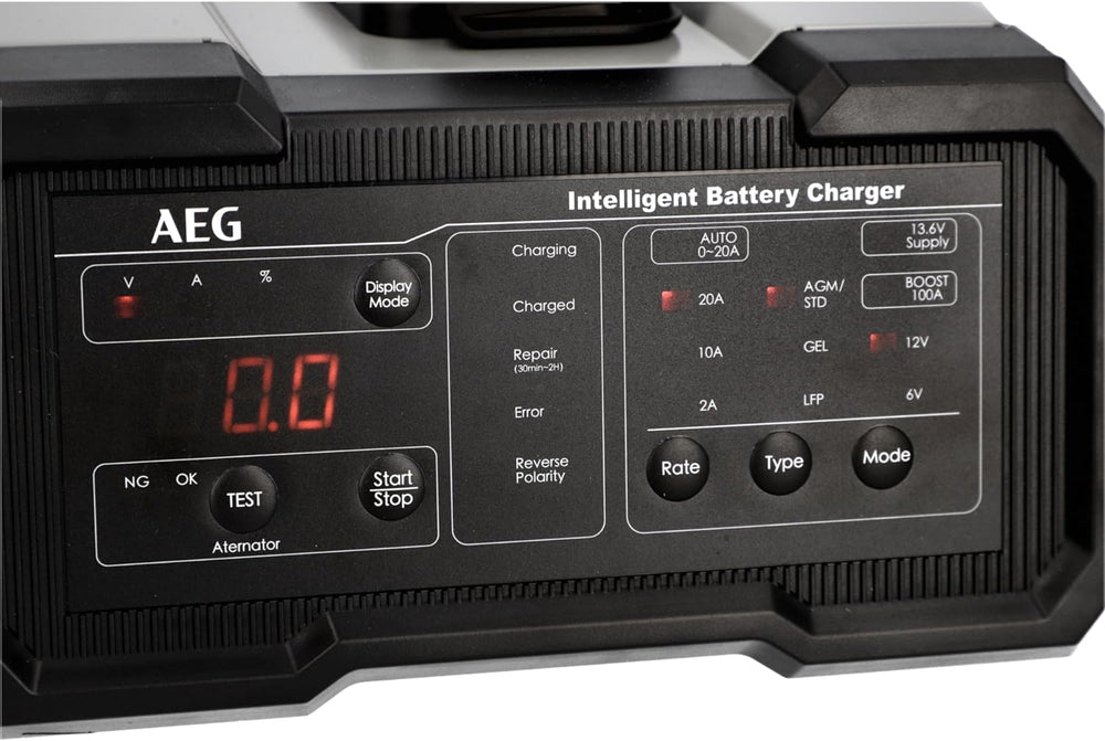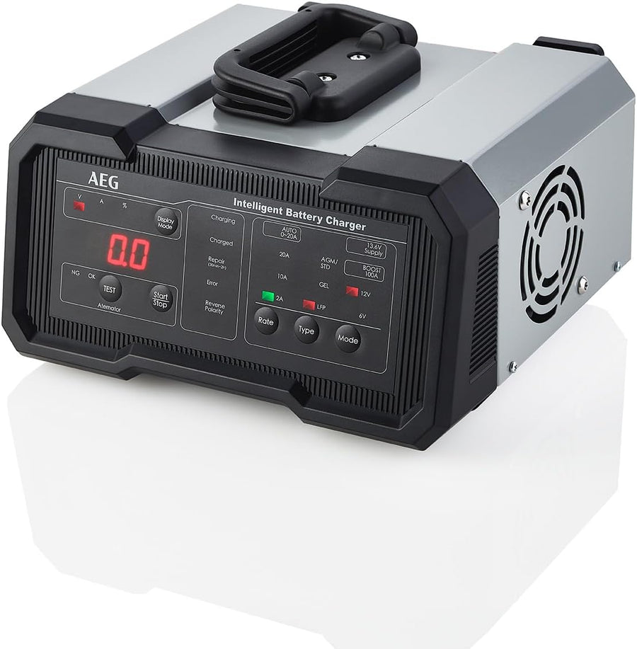 - PRAKTISCH: Das AEG Werkstatt Ladegerät hat ein robustes Metallgehäuse mit integriertem Tragegriff, eine Ladezustandsanzeige in % sowie schutzisolierte Batterieklemmen