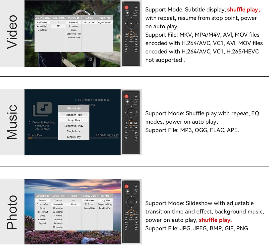 - Videoformat: RM, RMVB, AVI, DIVX, MKV, MOV, HDMOV, MP4, M4V, PMP, AVC, FLV, VOB, MPG, DAT, MPEG, TS, TP, M2TS, WMV (H.264, H.263, WMV9/VC-1, MPEG1/2/4)
