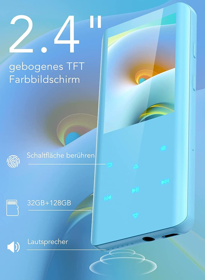 • ♫ 【2,4 Zoll TFT Farbbildschirm, 32+128GB Grosser Speicher】 Klares und schönes Display, geringer Stromverbrauch, mehr Energieeinsparung. Durch das gebogene Bildschirmdesign fühlt es sich eleganter und einfacher zu bedienen an. Der MP4-Player kommt mit 32GB Speicher. Ausserdem unterstützt 128GB TF-Karte (Enthält keine TF-Karte), wodurch Musik in grossen Mengen gespeichert werden kann.