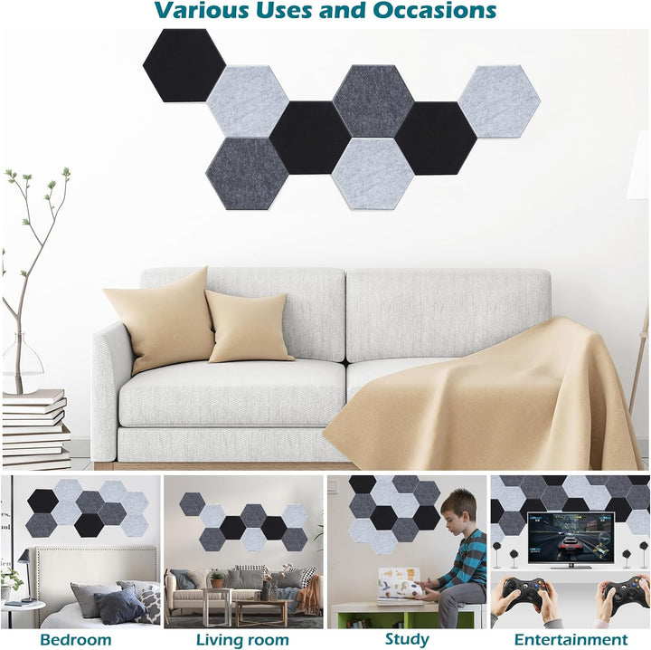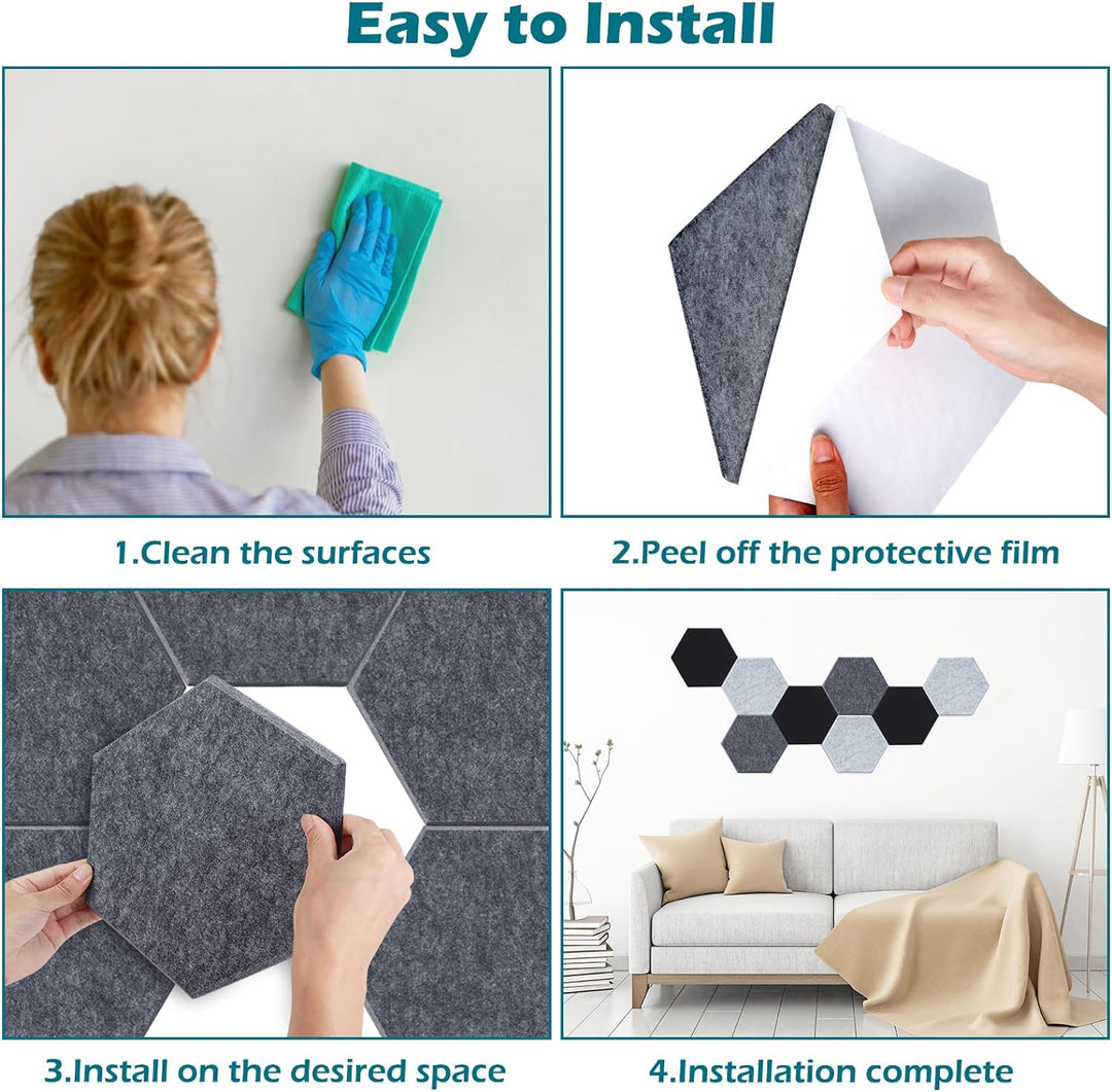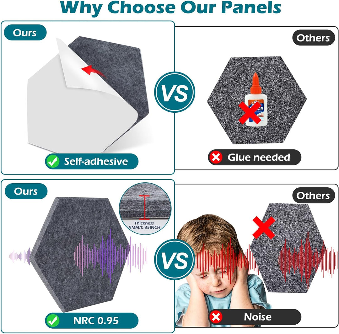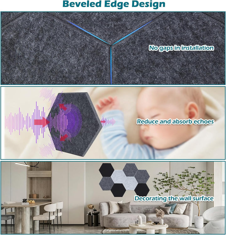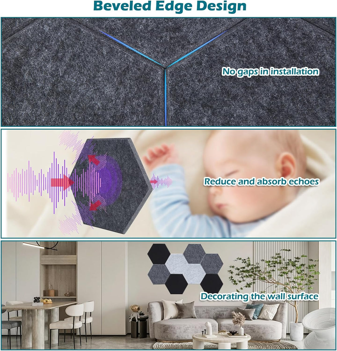 - SECHSECKIGES DESIGN: Unsere Akustikpaneele verfügen über ein abgeschrägtes Design, das bei der Installation keine Lücken hinterlässt und eine hervorragende akustische und lärmreduzierende Wirkung auf verschiedenen Oberflächen (Wände, Türen,