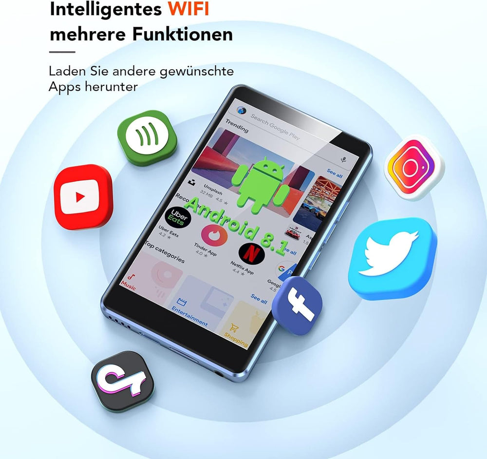 - 【Vielseitiger MP3-Player mit Bluetooth und WiFi】 Verbinden Sie sich über WiFi und Bluetooth 4.0. WiFi-Internetzugang, Online-Musik, Video, Spiele, kostenloser Zugang zu Apps - Facebook, Twitter, Spotify, TikTok usw. [Verwenden Sie nicht die