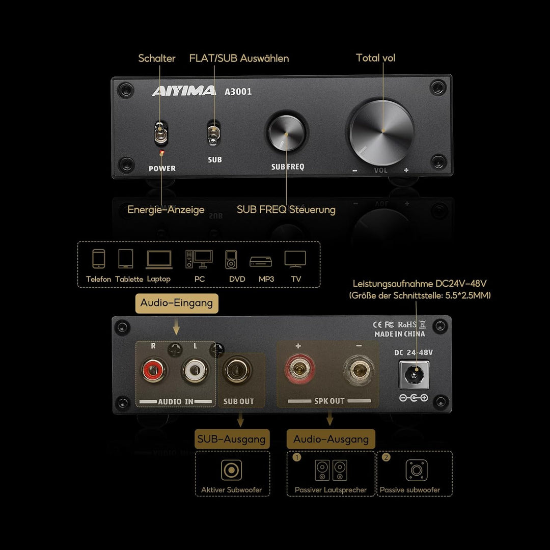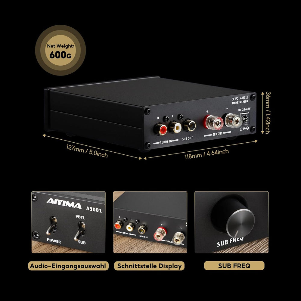 - Reine Klangqualität: Der AIYIMA A3001 Subwoofer-Verstärker verwendet den klassischen TPA3255D2-Chip und 3 NE5532-Operationsverstärker-Chips, Sie können einen klaren und reinen, hochwertigen Klang geniessen, und die Ausgabe ist stabil und einfach einzurichten. Toller Verstärker zum Antreiben von Regallautsprechern oder Subwoofern.