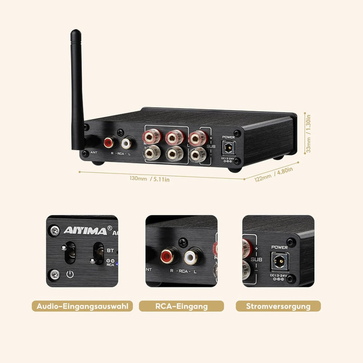 - Zwei Eingabemethoden: Der A03-Leistungsverstärker unterstützt den Bluetooth / RCA-Eingang, der an Multimediageräte wie Mobiltelefone, Tablets, Computer, MP3, Fernseher usw. angeschlossen werden kann.