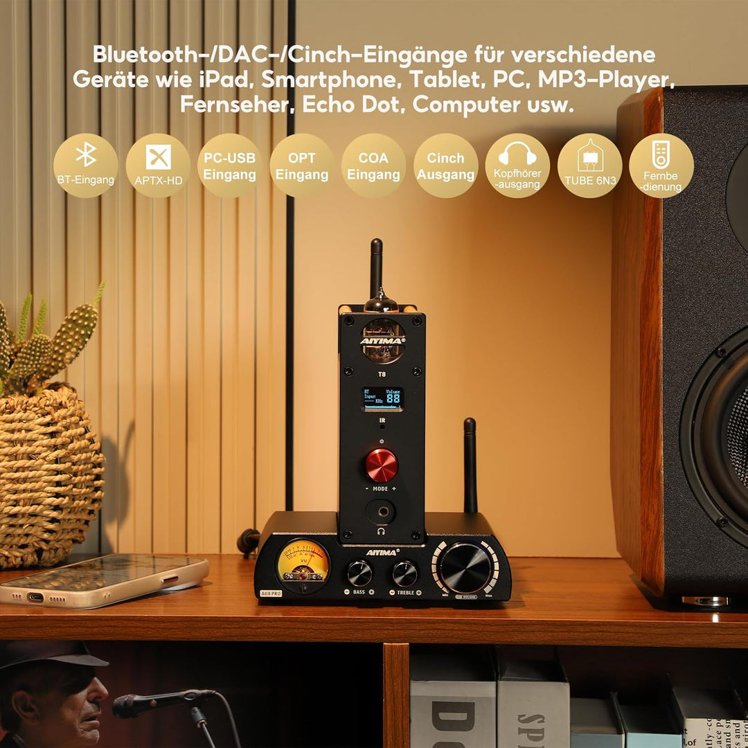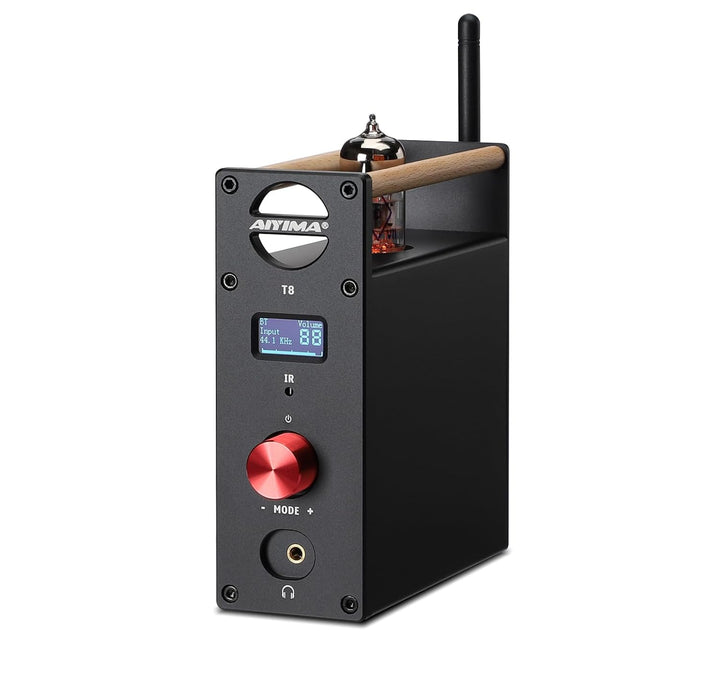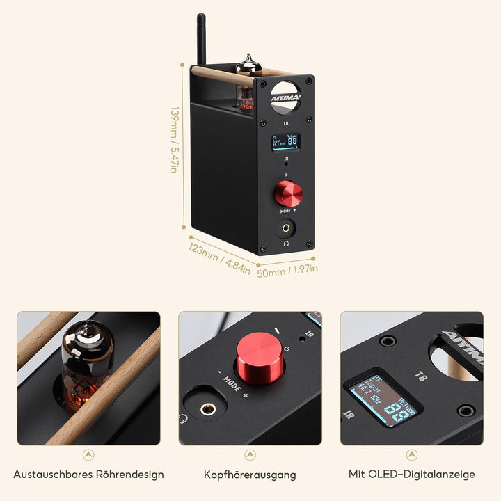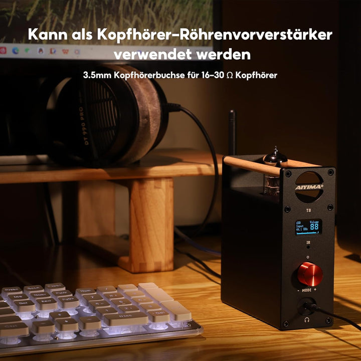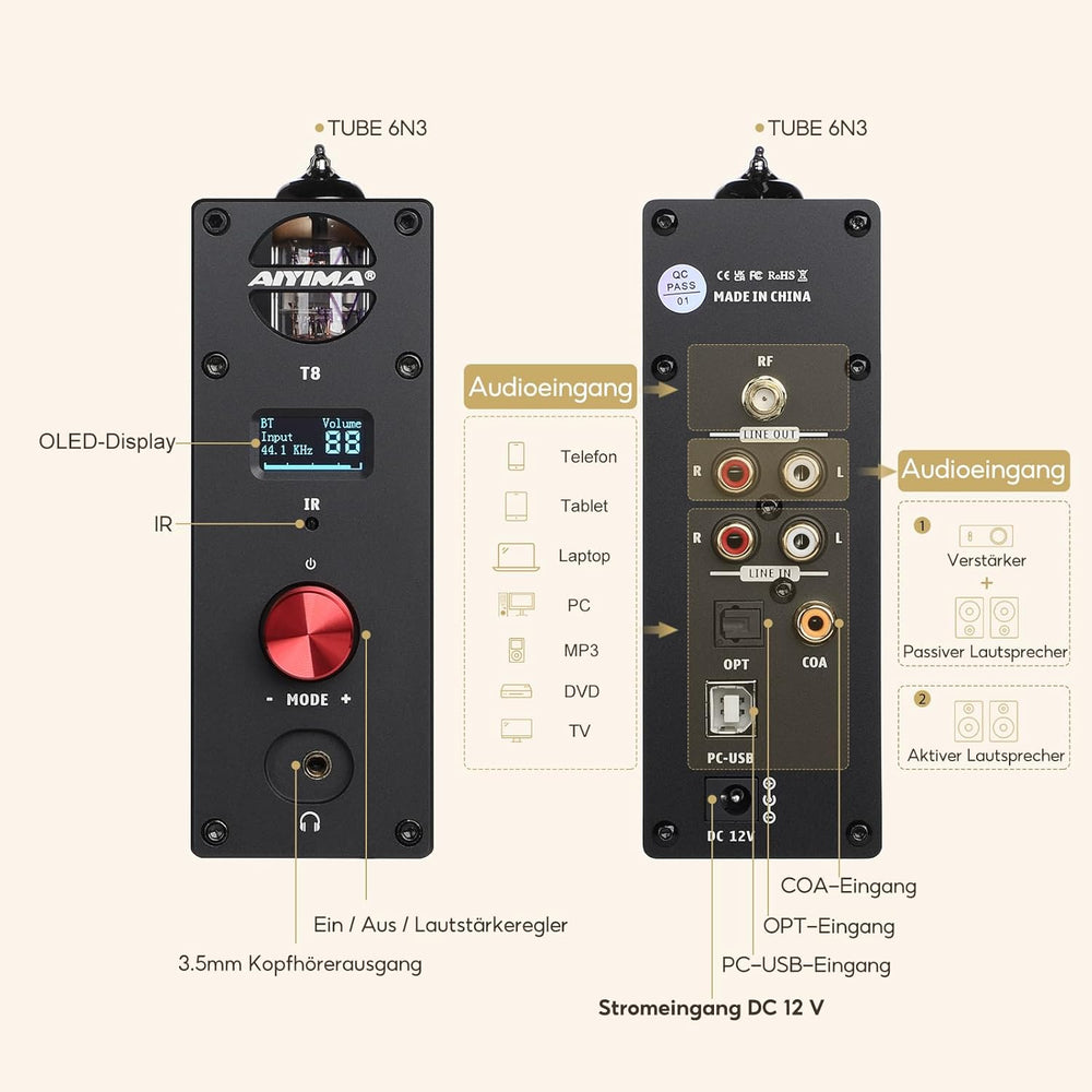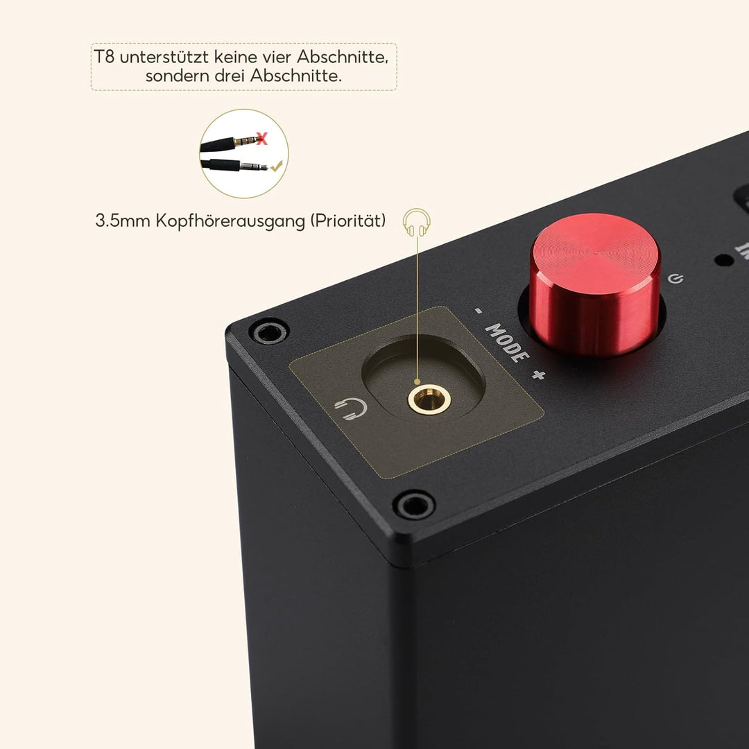 - Tube T8 kann als Kopfhörerverstärker verwendet werden: RCA/3,5-mm-Kopfhörerausgang (mit Priorität), RCA-Ausgang zum Aktivlautsprecher, Verstärker und passiven Lautsprecher, Kopfhörerausgang ist für 16~300 Ω-Kopfhörer und Headsets geeignet. Kann