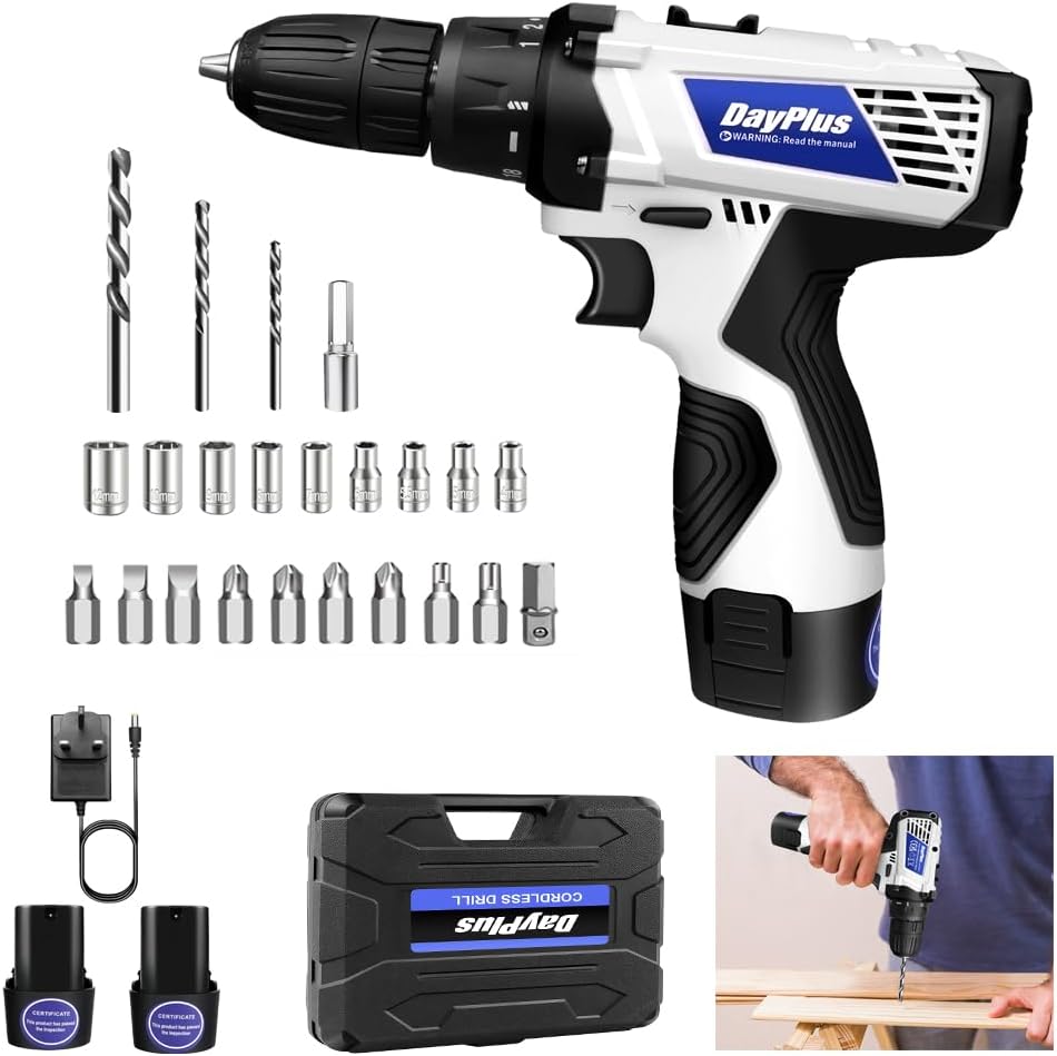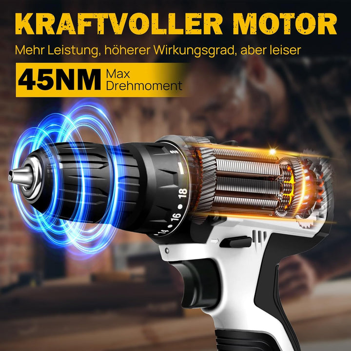 - 【Leistungsstarkes Kombi-DIY-Bohrwerkzeug】 - Dieser Elektroschrauber bietet eine hervorragende Leistung, wird mit einem leistungsstarken Li-Ionen-Akku und einem 60-minütigen Schnellladegerät, grosser Kapazität und längerer Akkulaufzeit geliefert