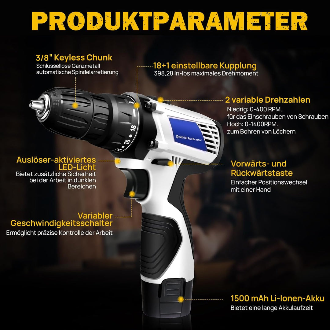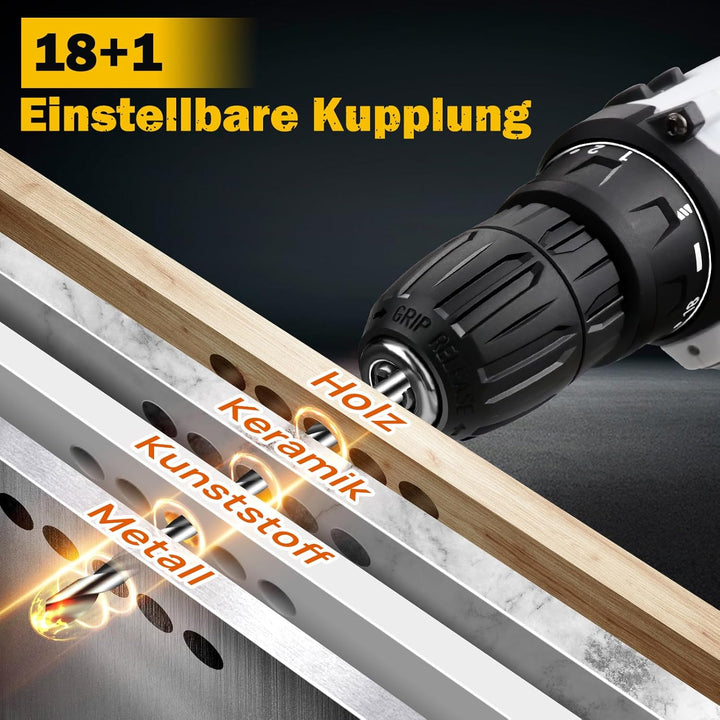 - 【3/8 "Schnellspannbohrfutter und Kupplung mit 18 + 1 Positionen】 -3 / 8 "(10 mm) Schnellspannbohrfutter mit automatischer Spindelarretierung hilft Ihnen, verschiedene Bohrer nach Bedarf einfach zu wechseln. Mit einem maximalen Drehmoment von 45 Nm