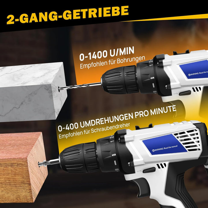 - 【Bohrer mit variabler Drehzahl und Schnellverschluss】 - Wechseln Sie zwischen Niedrig- und Hochgeschwindigkeitsmodi (0-400 / 0-1400 U / min), um eine präzise Steuerung für verschiedene Schraub- / Bohraufgaben zu gewährleisten und Beschädigungen