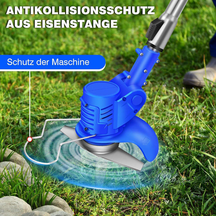 - ✅Verstellbarer Schneidkopf & Sicherheitsdesign: -Der Elektro-Trimmer Gartenkantenfräser hat einen 0-90° drehbaren Schneidkopf, der für die meisten verschiedenen Winkel komplexer Arbeiten geeignet ist. schnurloser Strimmer Anti-Kollisions-Eisenstab
