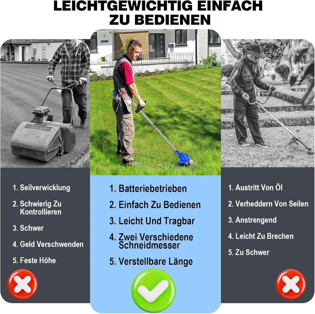 - ✅Leicht & einfach zu bedienen: -Dieser Gartenstrimmer wiegt nur 1,5kg, leicht, stabil und langlebig. Das kompakte Design macht es einfach für den Benutzer, mit einer Hand zu steuern.Rutschfester Softgrip-Gummigriff macht die Bedienung bequemer.