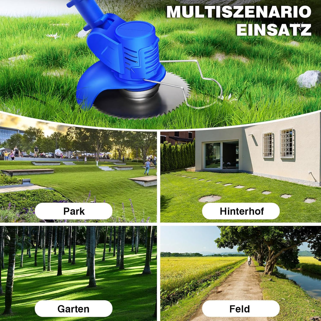 - ✅Was Sie bekommen: -Akku Rasentrimmer×1, 1500mAh Akku×1, Schnellladegerät×1, Metallklinge×10, Kreissägeblatt×2, Teleskoprohrverbinder×1, Schraubenschlüssel×1, Abstandshalter×1, Anti-Kollisions-Schrauben×1, Stossstange Kabel×1, Schutz×1,