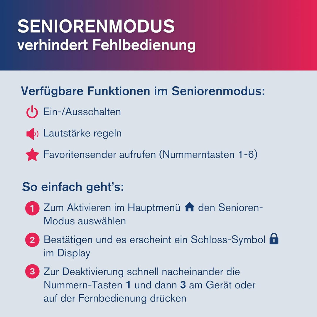 - Im Senioren-Modus stehen nur die Funktionen Ein-/Ausschalten, Lautstärke regeln und Favoriten-Sender aufrufen zur Verfügung. Es können keine Einstellungen versehentlich verstellt werden und somit ist eine Fehlbedienung komplett ausgeschlossen.