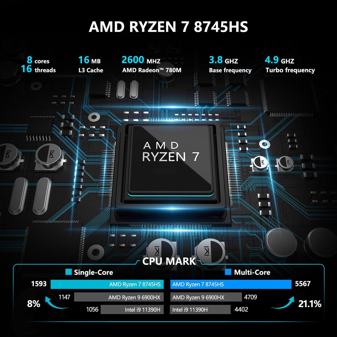 - ✅ Bis zu 256GB RAM & 4TB SSD erweiterbar - Der H90Pro 8745HS Mini PC kommt mit 32GB (2x16GB) DDR5-RAM (5600MHz, 42% schneller als DDR4 3200MHz) und ist per Dual-Channel auf bis zu 256GB (2x128GB) erweiterbar. Die PCIe Gen 4.0 NVMe SSD (1TB, bis