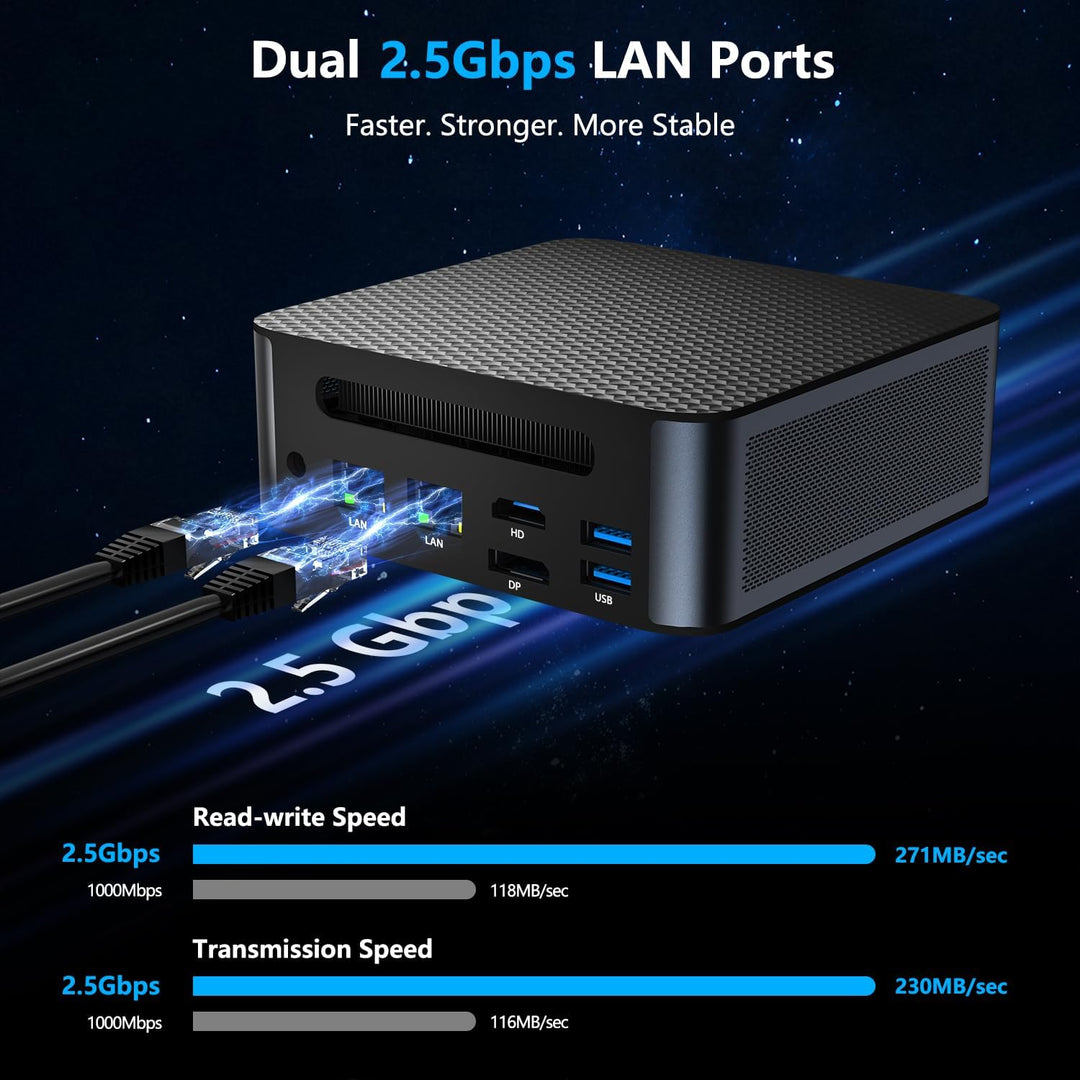 - ✅ Dual 2,5G LAN - Maximale Geschwindigkeit & Flexibilität! Kombinieren Sie die Ports für bis zu ~5 Gbps Durchsatz mit NAS/Servern. Ideal als leistungsstarker Router/Firewall (ein Port für Modem, einer fürs Netzwerk). Gleichzeitige, sichere