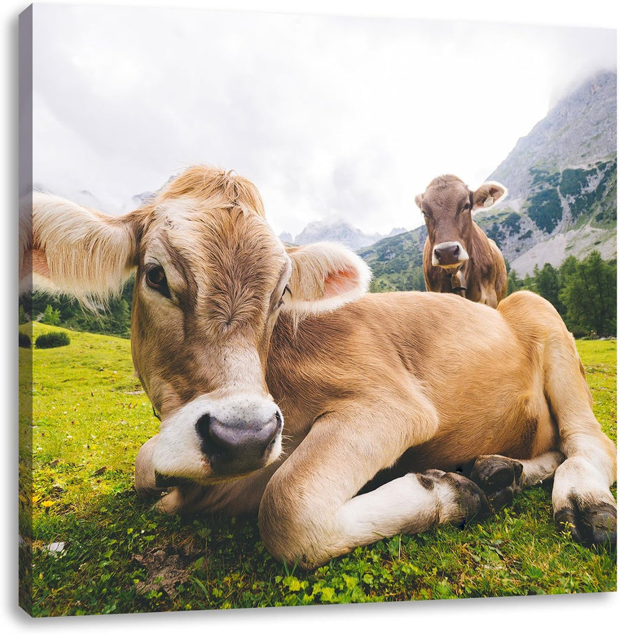 Almkuh in den Bergen, Format: 70x70 auf Leinwand, XXL riesige Bilder fertig gerahmt mit Keilrahmen,