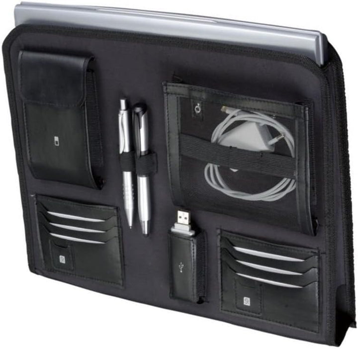 - Mit herausnehmbarem Inlay mit Laptop-/ Tabletfach (bis 13 Zoll), Smartphone Hülle, 2 Stifteschlaufen, 8 Visiten-/ Kreditkartenfächer, 2 SD-Karten Fächer, Netzfach und Einsteckfach für USB-Sticks und Kabel, etc.