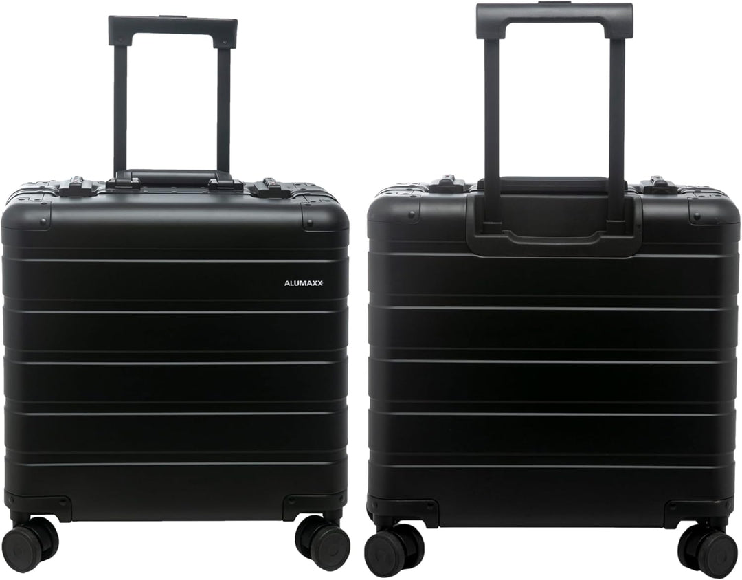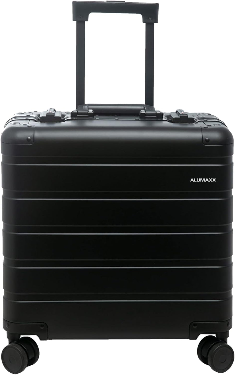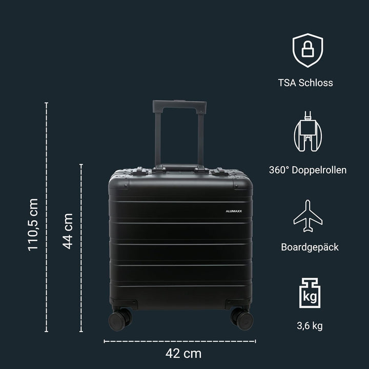 PRODUKTBESCHREIBUNGEN Alumaxx - Edle und funktionelle Ausstattung für den Arbeitsalltag! Dieser elegante Businesstrolley GRAVITY der Marke Alumaxx aus hochwertigem Voll-Aluminium in matt schwarz ist mit seiner repräsentativen Optik der optimale Begleiter auf jeder Geschäftsreise. Die hochwertige Verarbeitung und eine intelligente Innenausstattung mit höchstem Komfort verleihen diesem Reisetrolley eine ganz besondere Note. Er hat einen ergonomischen Tragegriff, verstärkte Kanten und ein sicheres TSA Schloss System mit Zweifachverschliessung. Für einen komfortablen Transport ist der Koffer mit einem arretierbaren Teleskoptrolleysystem mit einer Höhe von circa 110,5 cm und vier hochwertige 360° Leichtlaufrollen ausgestattet. Innen besticht das praktische Gepäckstück durch ein geräumiges Overnightfach mit Packgurt sowie ein herausnehmbares Fächerfach mit Netzfach mit Reissverschluss, Einsteckfächern und drei Stiftschlaufen. Die Aussenmasse des Trolleys betragen circa 44 x 42 x 22,5 cm, sein Innenmass ist circa 37,5 x 41,5 x 20 cm und sein Gewicht liegt bei etwa 3,6 Kg. Bei vielen Fluglinien ist der Alukoffer als Bordgepäck bzw. Handgepäck zulässig, Bitte aber vorab informieren. Alumaxx – Der Spezialist für besondere Anforderungen! Unterschiedliche Einsatzbereiche erfordern individuelle Merkmale bei der Konstruktion und Ausstattung eines Koffers. Was auch immer und auf welchem Weg transportiert werden soll – Alumaxx bietet den optimalen Stauraum und maximalen Schutz.