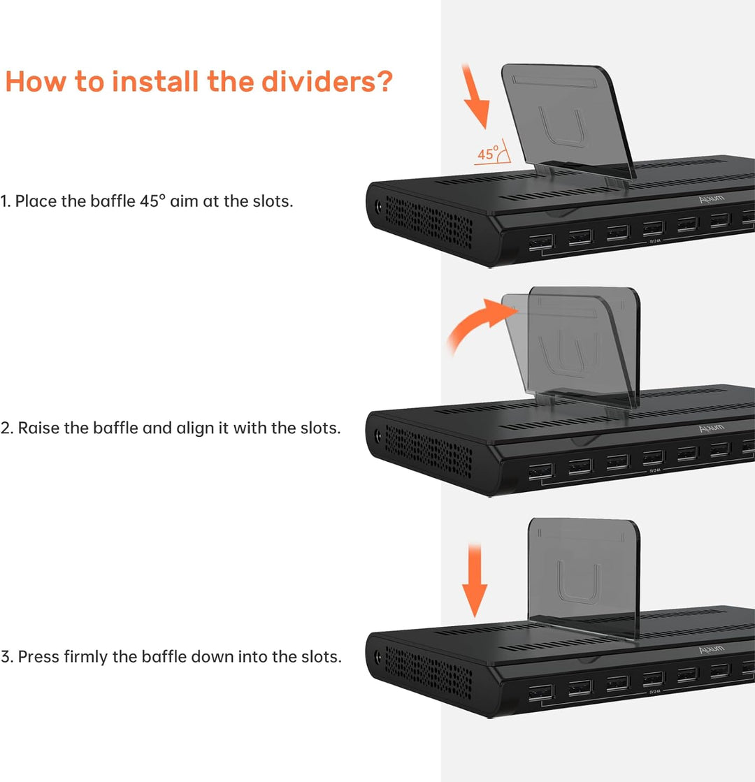 - 【Detachable divider】Die Trennwand des Handy Ladestation 10 port ist abnehmbar und kann auf Reisen für den einfachen Transport entfernt werden. Entworfen, um kompakt zu sein, wird es nicht zu viel Platz einnehmen, wo immer Sie es verwenden.