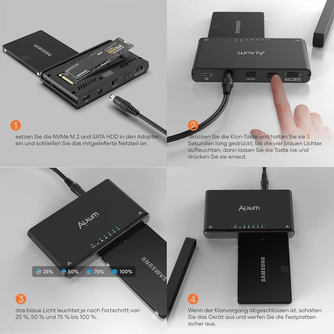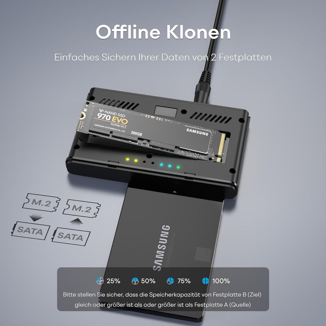 - 【3-in-1-Adapter】Diese ist ein M.2 NVMe Adapter,ein 2,5/3,5 Zoll SATA HDD/SSD Festplattenadapter und ist auch ein M.2 und SATA Festplattenduplikator.Unterstützt die Verwendung in mehreren Szenen und erfüllt Ihre täglichen Bedürfnisse.