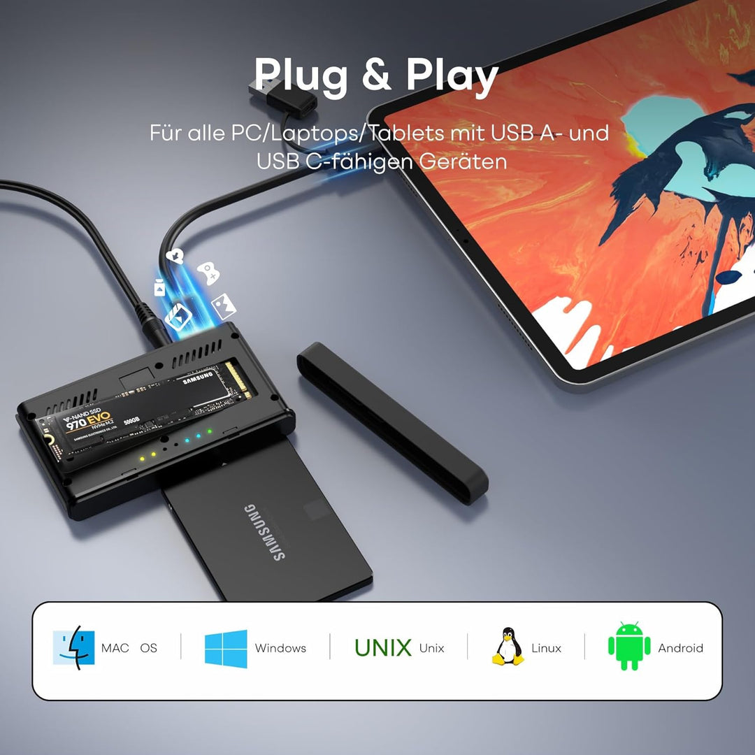 - 【10Gbps Datenübertragung】Das Dual Bay M.2 und SATA Gehäuse ermöglicht 10Gbps Super-Speed Datenübertragung. Wie getestet, dauerte es etwa vier bis fünf Minuten, um eine 256GB m.2 SSD in eine 6TB zu klonen. Schneller und effizienter
