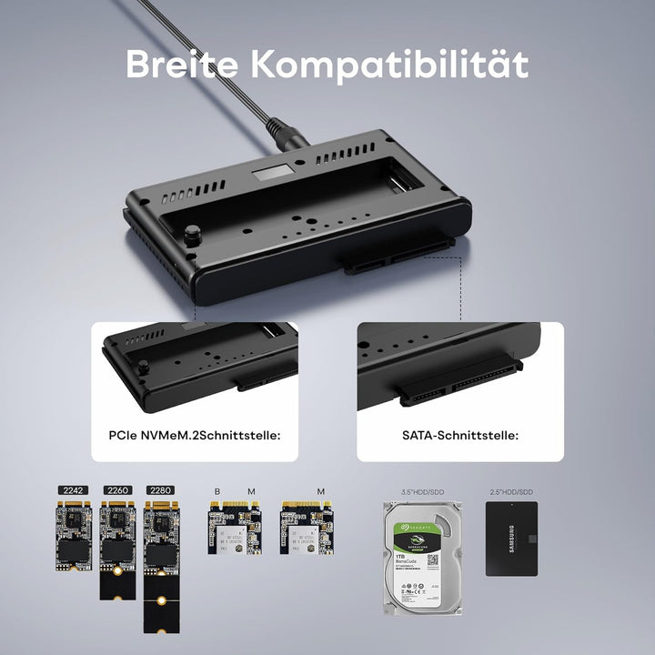 - 【Weite Kompatibilität】Compatible with M.2 NVMe PCIe M key, PCIe B&M key SSD and AHCI/SATA 2.5"/3.5" SSD&HDD. This applies to solid state drivers of sizes 2242, 2260, and 2280.