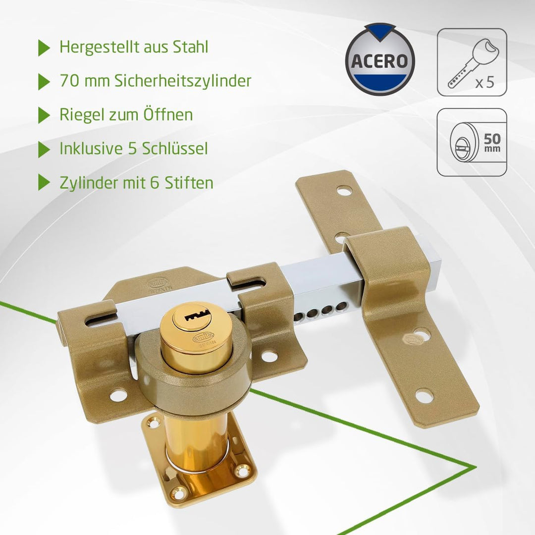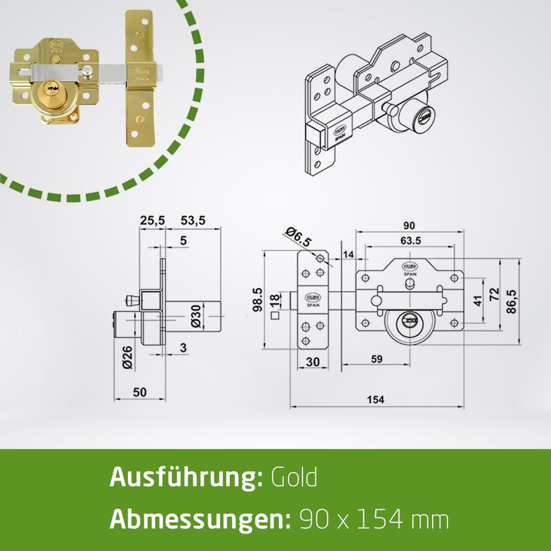 - Beschreibung: Hochsicherheitsriegel mit rundem Zylinder für hohe Sicherheit aussen und innen. Masse: 90 x 154 mm. Länge des Zylinders: 50 mm. Hergestellt aus Stahl. Goldfarben.
