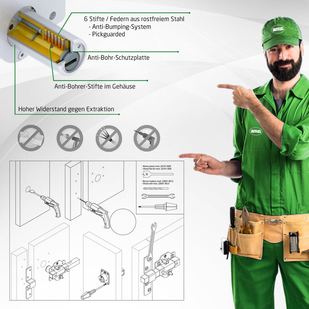 - Hohe Sicherheit: 6-poliger Zylinder mit Edelstahlfedern. Anti-bumping-System und Anti-Diebstahl Schutz. Bolzen gegen Aufbohren im Körper. Platte mit Bohrschutz Hohe Beständigkeit gegen Zerrung, Krafteinwirkung, Starten, Bruchfestigkeit