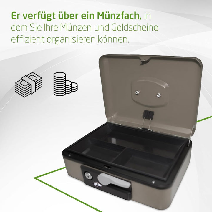 • PRAKTISCH: Kleine Kasse mit einem Griff oben für einfache Transportmöglichkeiten. Enthält ein Münz- und Scheinfach für effiziente Organisation von Münzen und Geldscheinen.