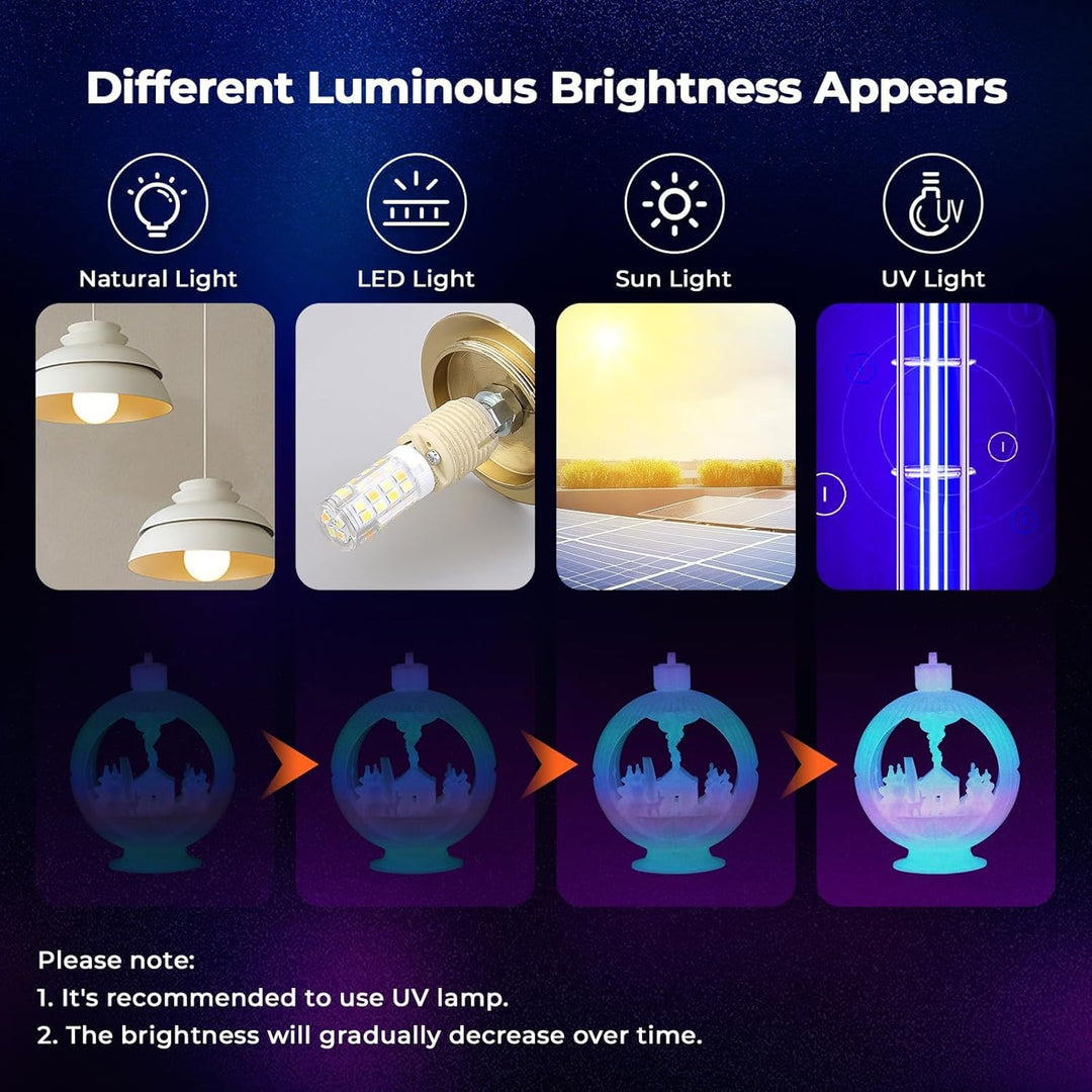 - 【Lang anhaltendes Leuchten mit UV-Licht】: Verstärken Sie den Leuchteffekt, indem Sie das Filament 30 Minuten lang UV-Licht aussetzen. Dies verlängert die Leuchtdauer und sorgt dafür, dass Ihre 3D-gedruckten Objekte hell leuchten und im Dunkeln
