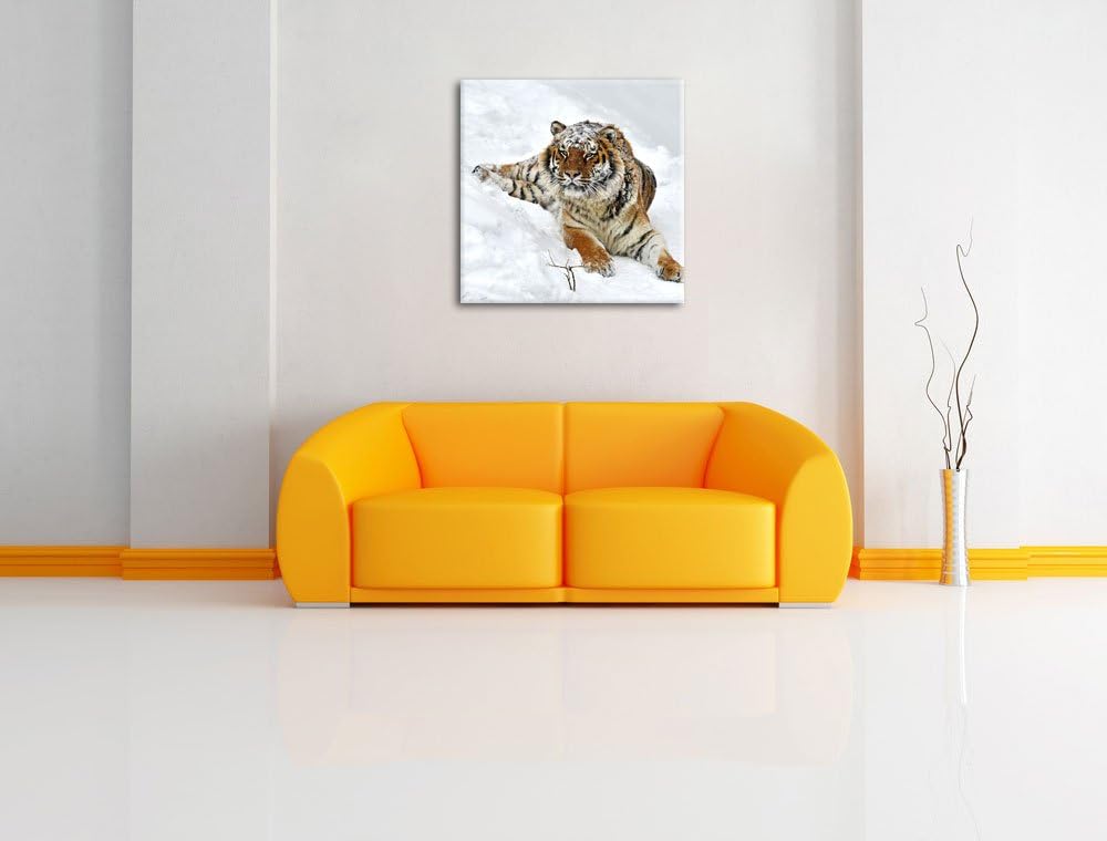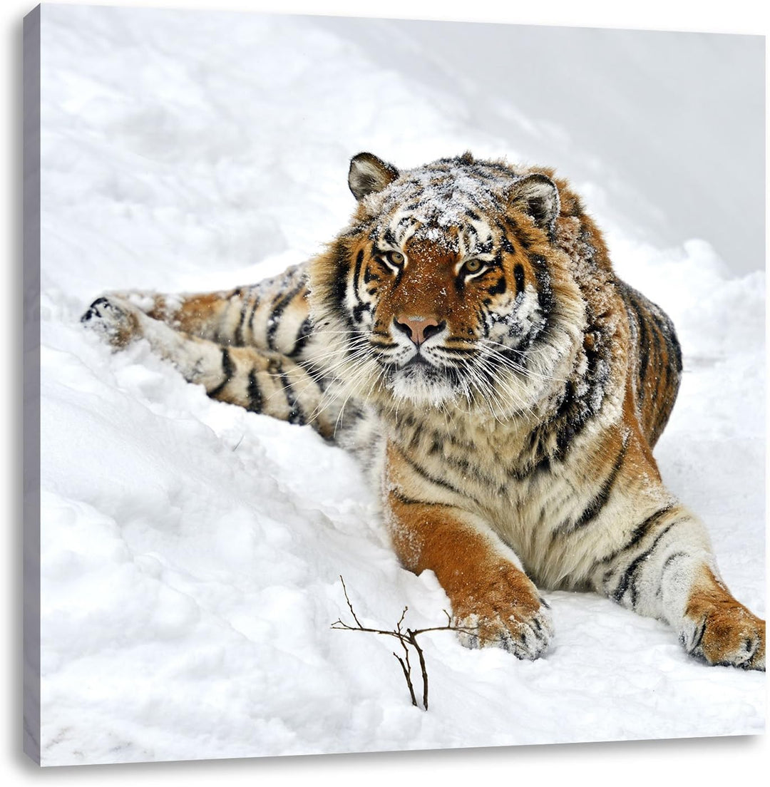Amur Tiger im Schnee, Format: 70x70 auf Leinwand, XXL riesige Bilder fertig gerahmt mit Keilrahmen,
