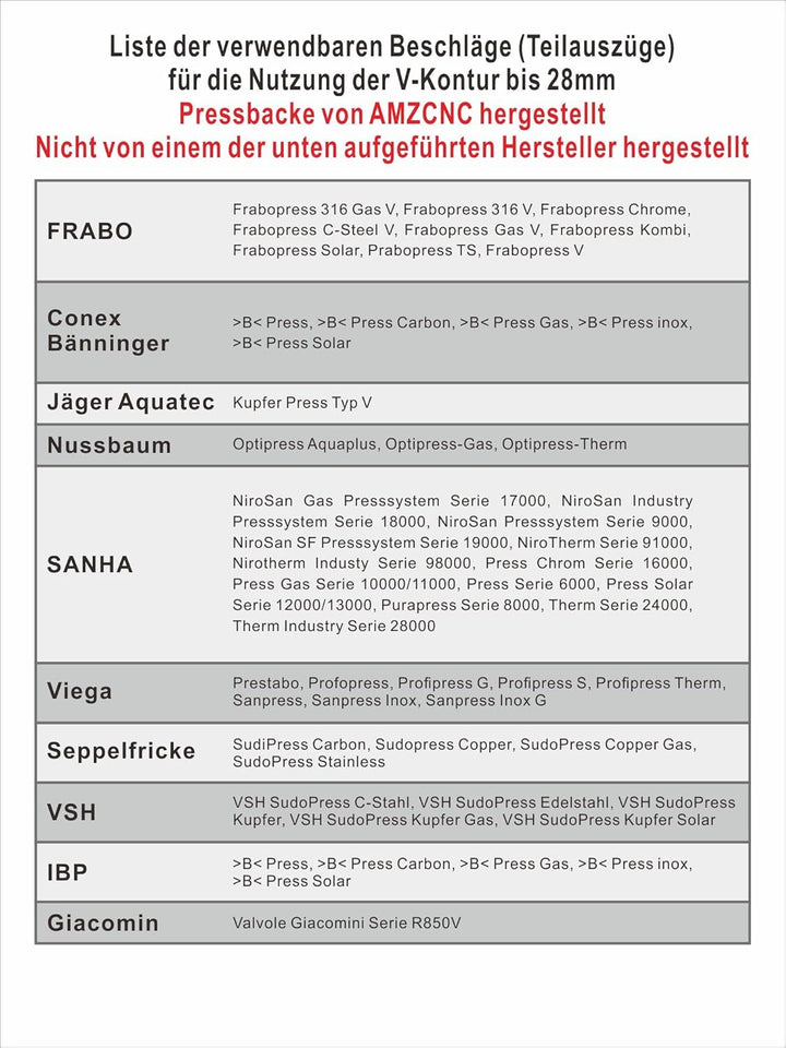 - V-Kontur ( Presskontur ) mit Pressbacken in 12mm, 15mm, 18mm, 22mm, 28mm für Kupferrohr, C-Stahlrohr und Edelstahlrohre verwendbar ( siehe Hersteller unten )
