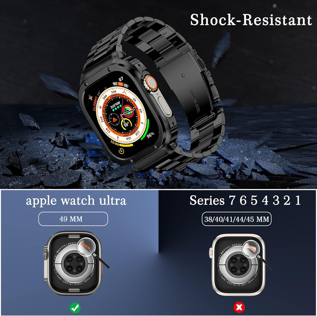 - 【Edelstahl 49mm Gehäuse】Das Metall Apple Watch Band ist poliert und aus hochwertigem Edelstahl gefertigt, viel haltbarer und robuster. Bereitstellung von Schutzabdeckung gegen Stösse und Kratzer. Die stossfeste apple watch ultra Fall kann genau mit