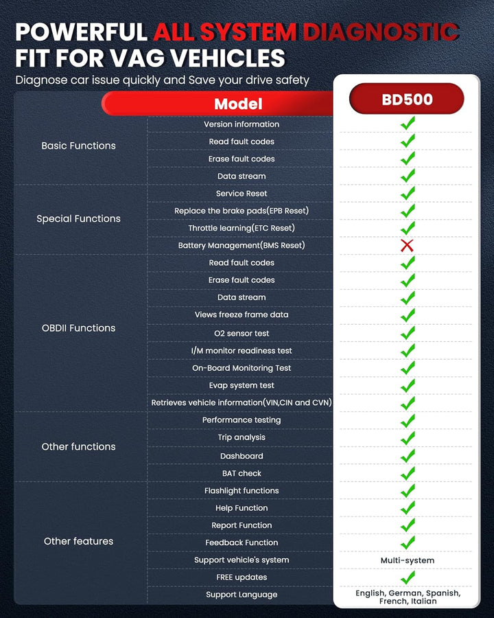 - ➤【Professionelles VAG Dagnose + Volle Systemdiagnose】ACNEL BD500 Bluetooth OBD2 Diagnosegerät ist für VW/Audi/Skoda/Seat etc. VAG Serie Fahrzeugdiagnose. ACNEL BD500Pro hat nicht nur Zugriff auf des Antriebsstrangs, des Fahrwerks, der Karosserie,