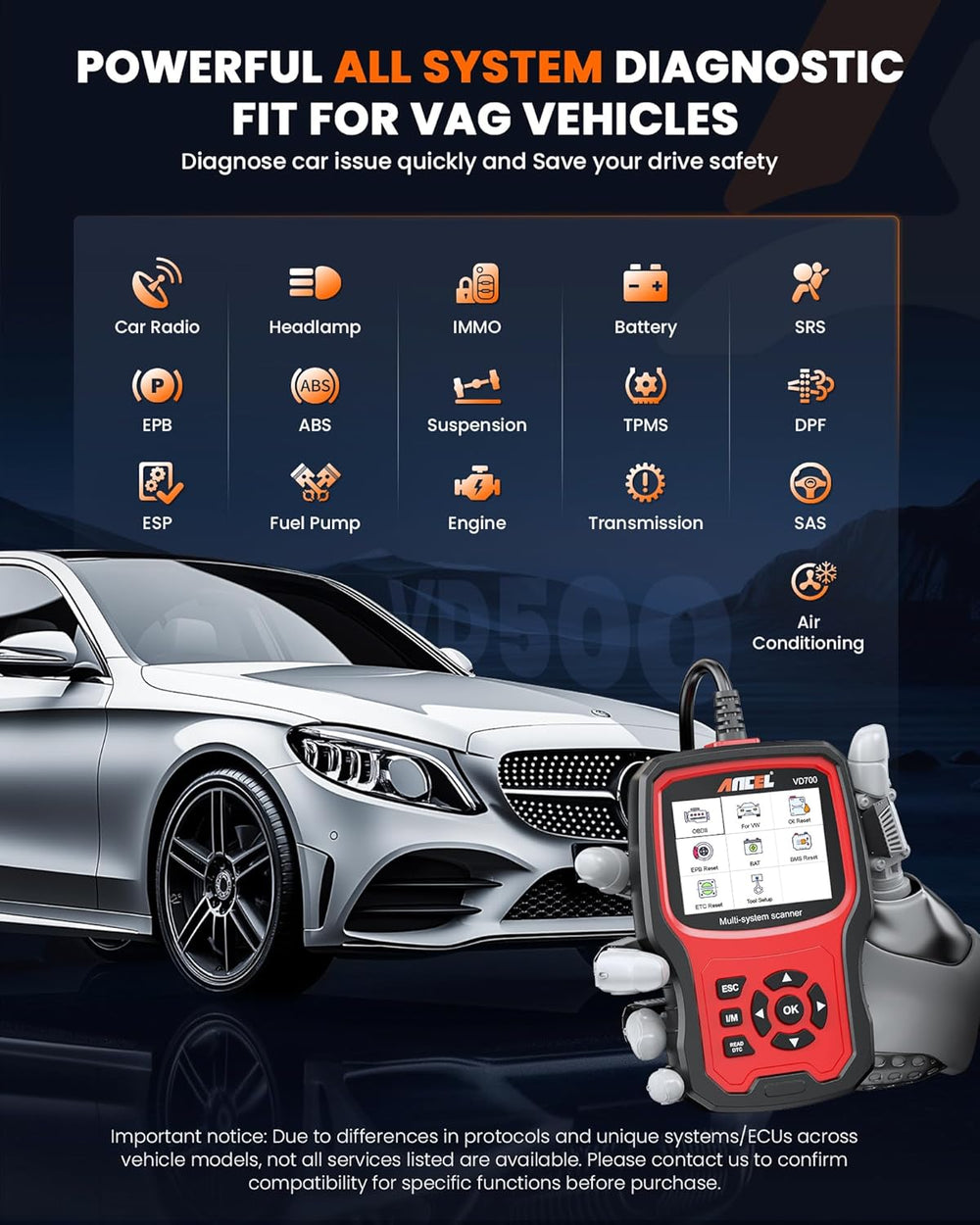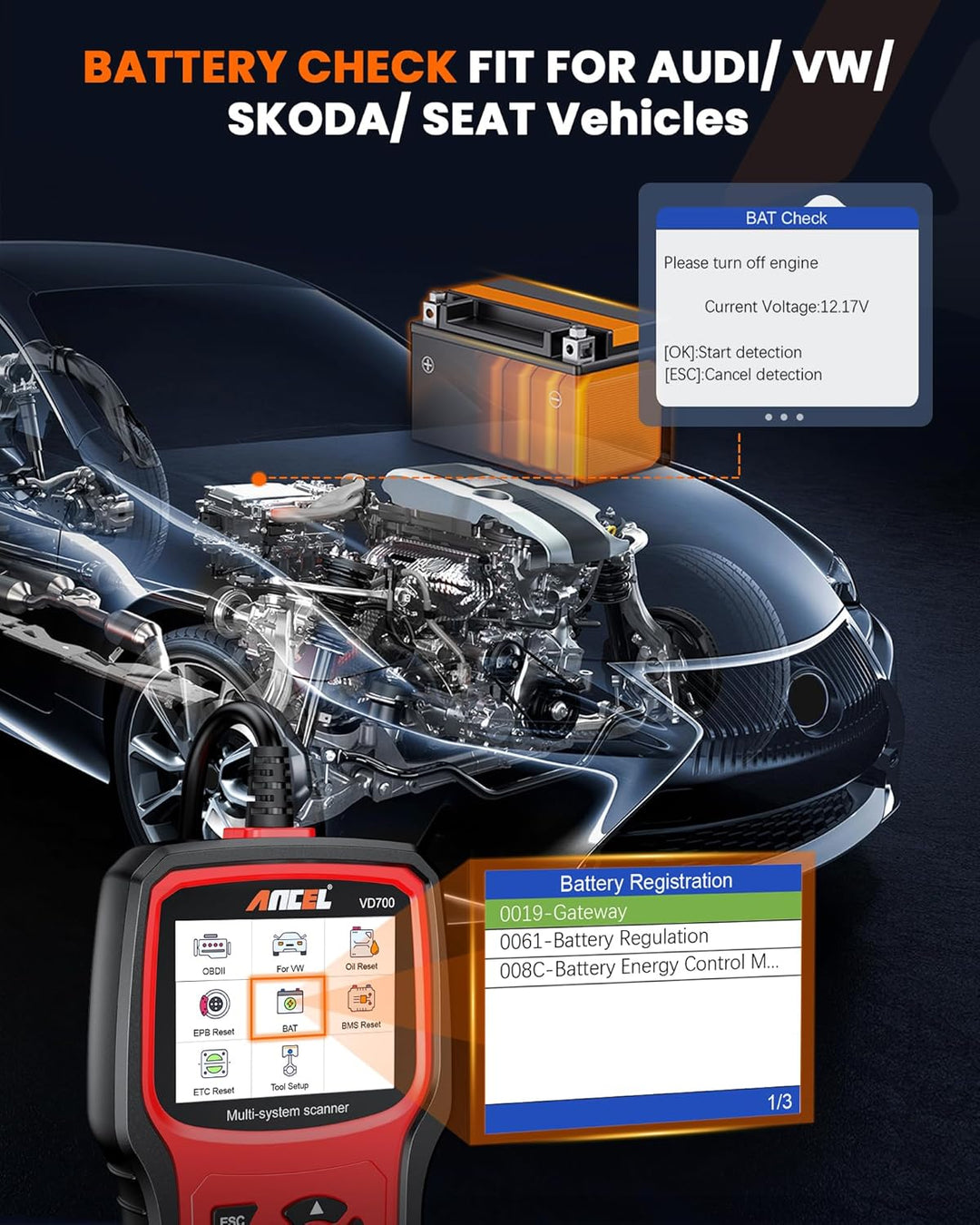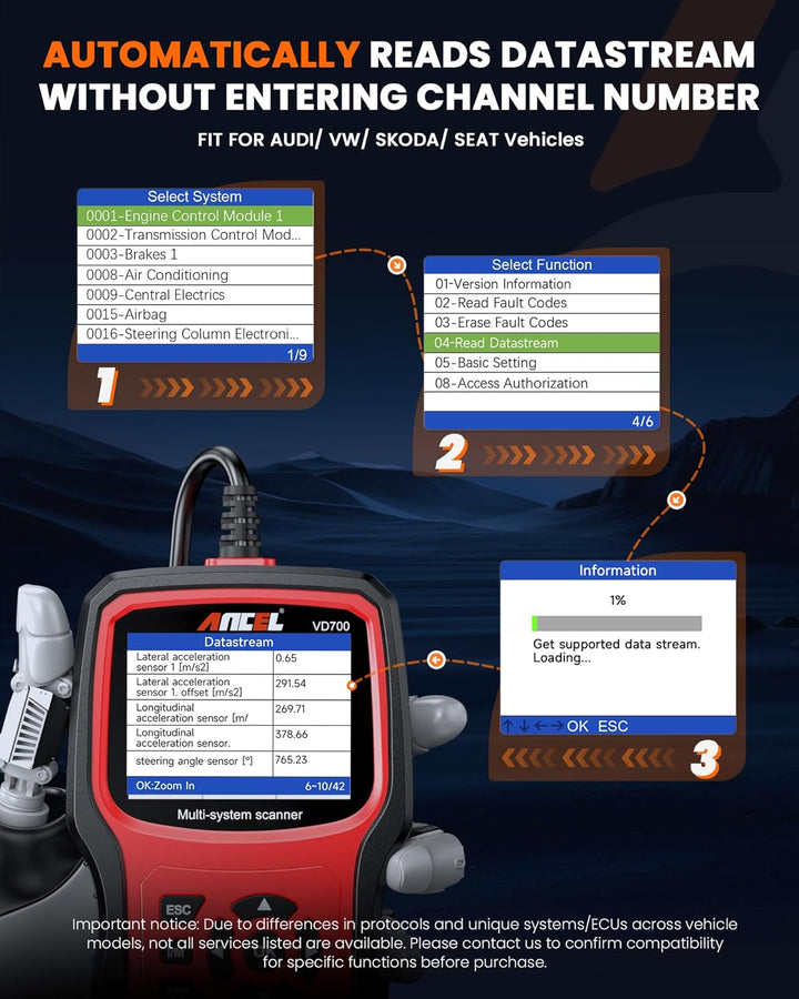 - 【Warme Tipps vor dem Kauf】ANCEL Upgraded Version OBD2 Diagnosegerät für VAG Fahrzeuge wird für die Fehlersuche bei Modellen der Marken VW/AUDI/SKODA/SEAT verwendet. Um die Kompatibilität zu gewährleisten, geben Sie uns bitte vor dem Kauf Ihr