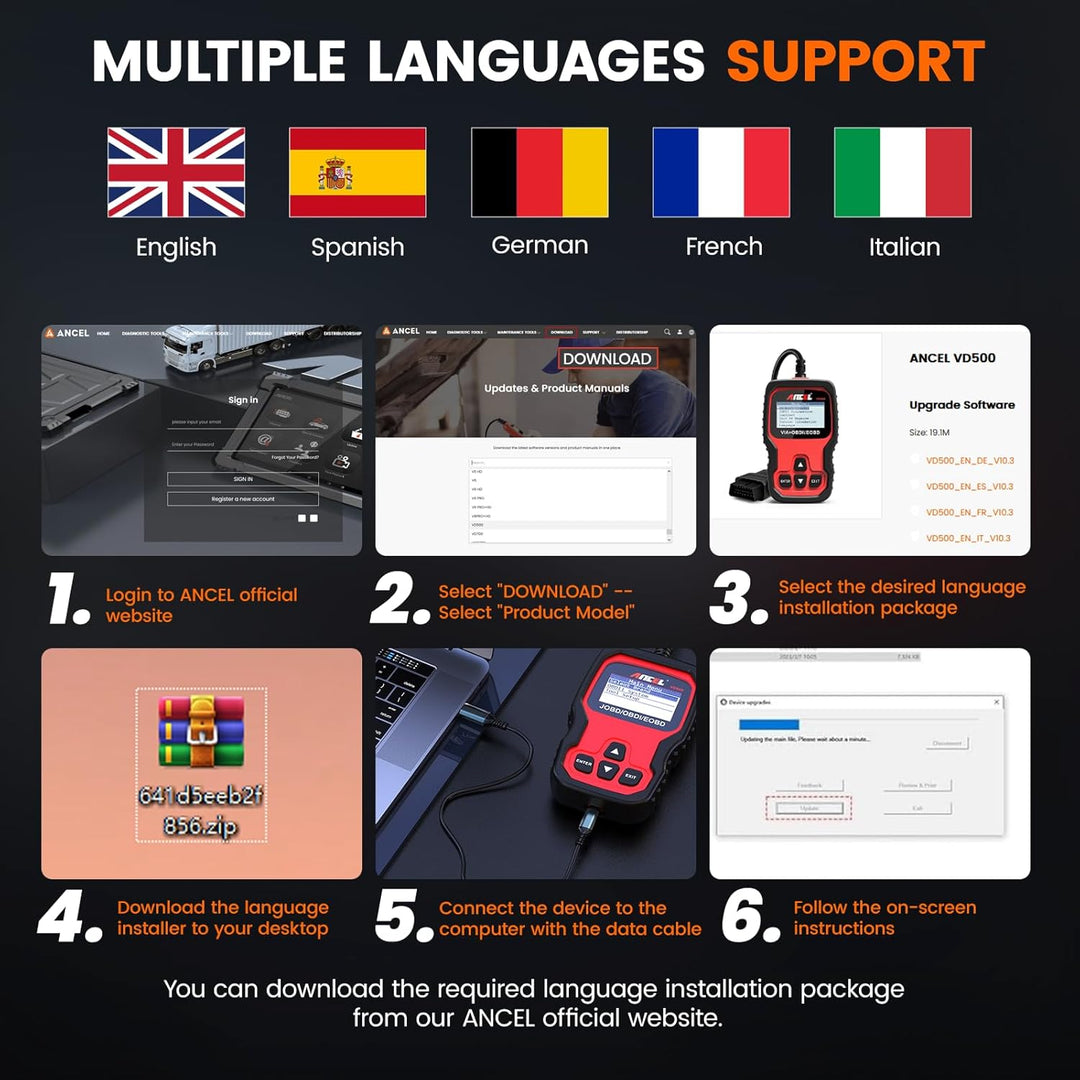 - Arbeitet mit den Sprachen Englisch und Deutsch. Der VD500 OBD2 Scanner kommt mit lebenslanger kostenloser Software-Updates für um die aktuellsten Fahrzeuge und deren Fehlermeldungen und Parameter lesen zu können. Die Software kann jederzeit von der
