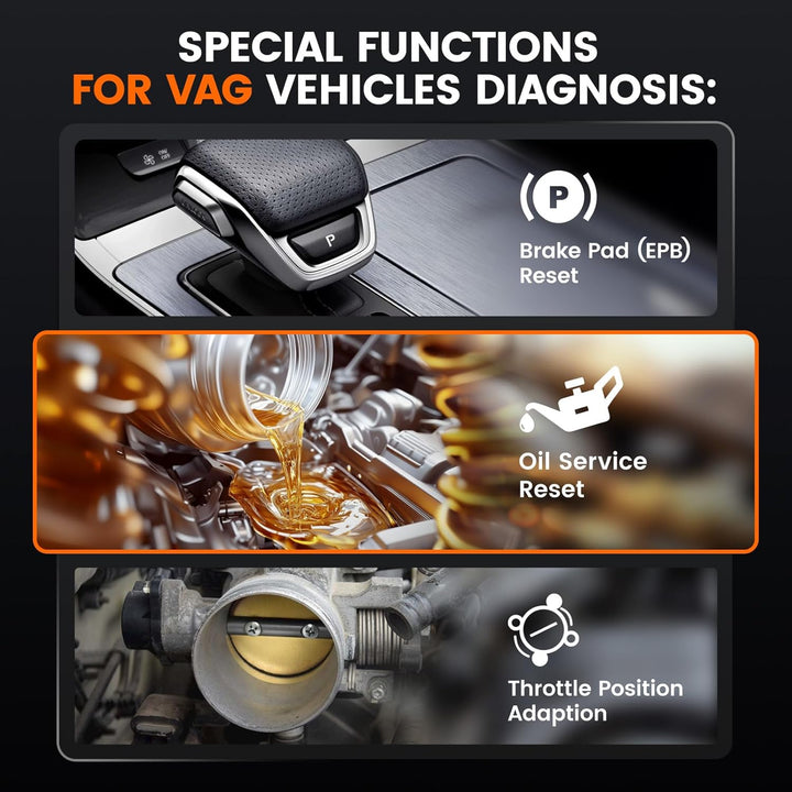 - Für Volkswagen (VAG) Fahrzeuge, kann der Scanner nicht nur die Fehler auslesen sondern auch löschen. Funktioniert für Motor, ABS, Getriebe, SAS (nicht alle Fahrzeuge), ESP, TPMS und weitere Systeme, auch Einstellungen für den nächsten Ölservice,