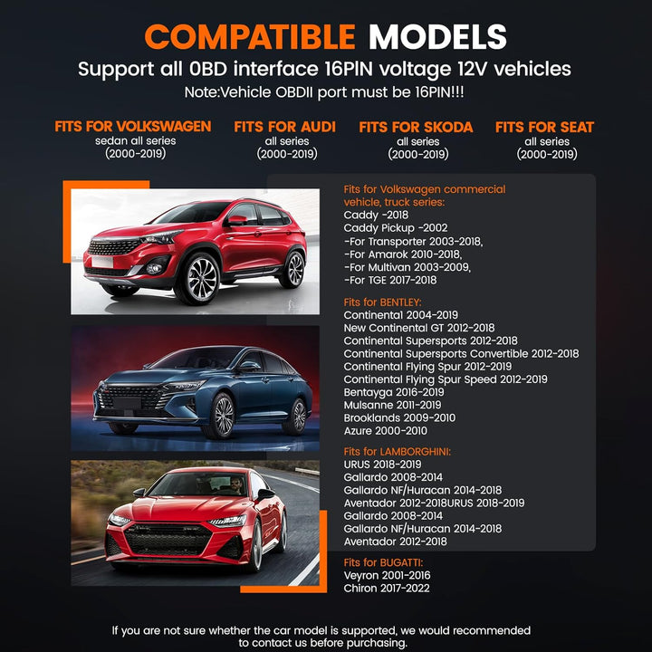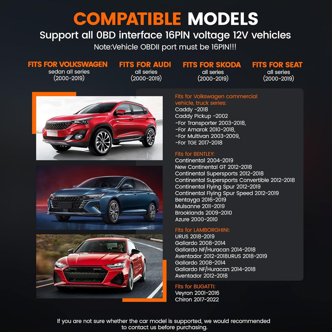 - Entwickelt für die Fehlerdiagnose der meisten 12V 16Pin Volkswagen Audi Skoda Seat V/A-Serie Fahrzeuge, und 12V ab 2000 und neuer, OBD II kompatibel mit 16 Pin OBD2-Anschluss (J1850 VPM, J1850PWM, ISO9141, KWP 2000 und CAN). Hinweis: Spezielle