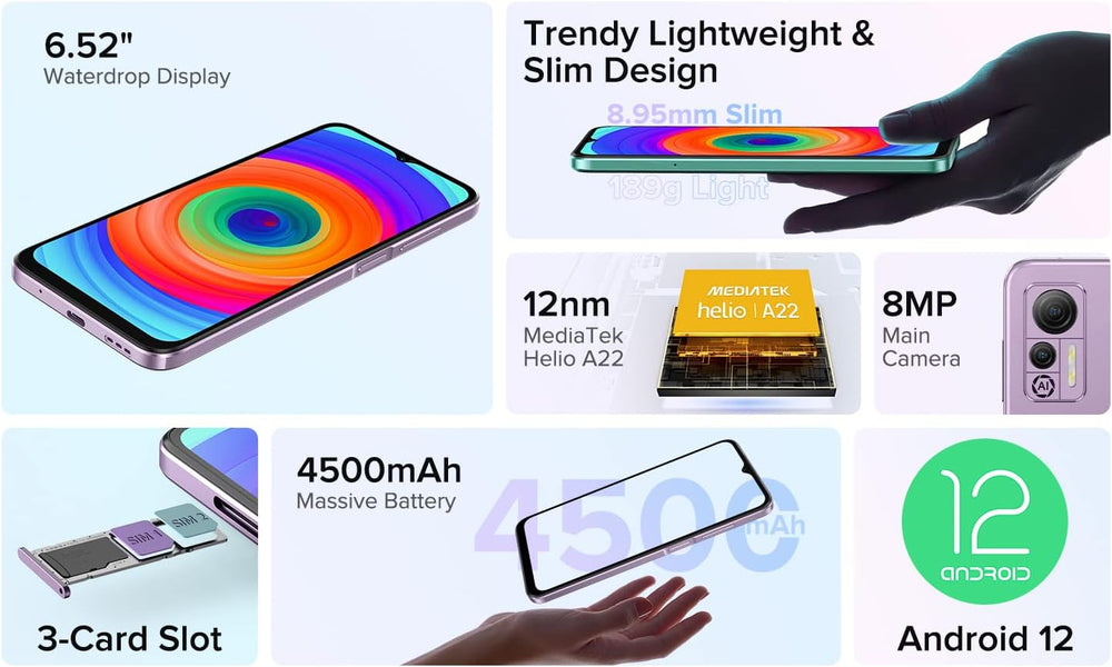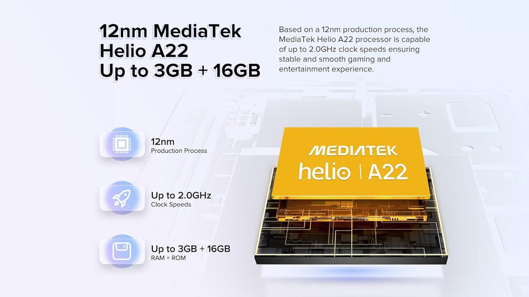 - ★【12nm MediaTek Helio A22】Basierend auf einem 12nm-Fertigungsprozess ist der MediaTek Helio A22-Prozessor in der Lage, bis zu 2.0GHz zu takten, um ein stabiles und flüssiges Spiel- und Unterhaltungserlebnis zu gewährleisten. (3GB RAM+16GB ROM, unterstützt externe SD-Karte bis zu 256GB)