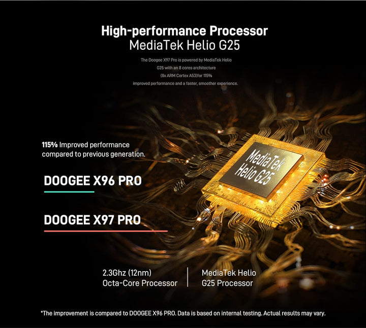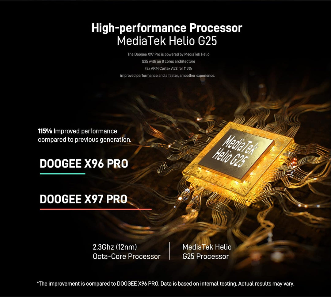- ★【Leistungsstarker Prozessor, MediaTek Helio G25:】Das DOOGEE X97 Pro ist mit dem MediaTek Helio G25 (8 Kern CPU-Architektur: 4 x Arm Cortex A53 und 4 x Arm Cortex A53) für 115% verbesserte Leistung und ein schnelleres, flüssigeres Erlebnis