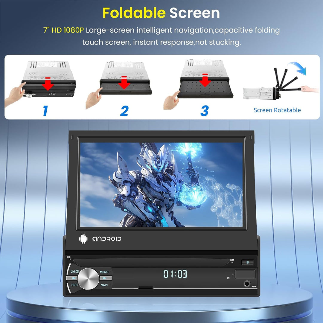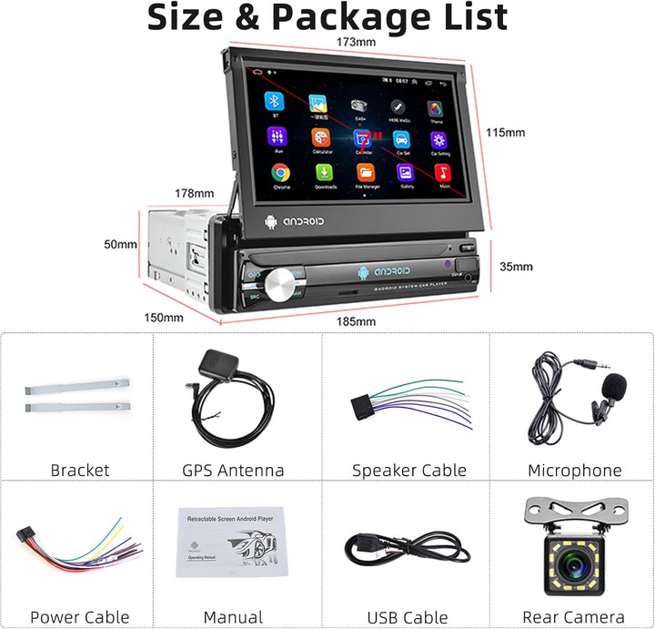 - 【Android Car Multimedia Player】2GB RAM ensure smooth operation and faster response. 32GB ROM supports more apps installed. This is a 1 din Android 10.0 car radio with 7 inch HD 1080P screen smart navigation, foldable capacitive touch screen. The screen resolution is 1024 * 600. The car radio supports WIFI, GPS navigation, Bluetooth, FM radio, Phone Mirror Link, Steering wheel control, with a 12 LEDs rear view camera and Microphone. Installtion size: 178*50mm