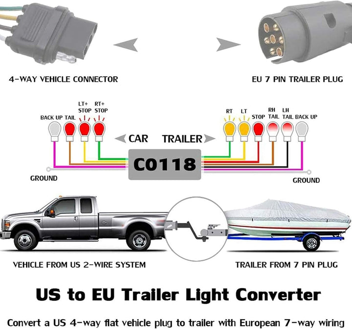 - Hinweis ---- Wenn Ihr US Fahrzeug über den 4-poligen Flachstecker verfügt und Ihr europäischer Anhänger über den 7-poligen Rundstecker verfügt, wo Ihr US-Fahrzeug die Stopp- und Schlusssignale trennen muss, muss dieser Anhängerverkabelungsadapter verwendet werden .