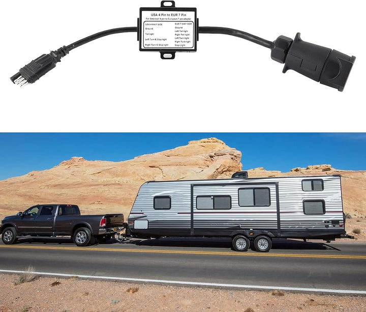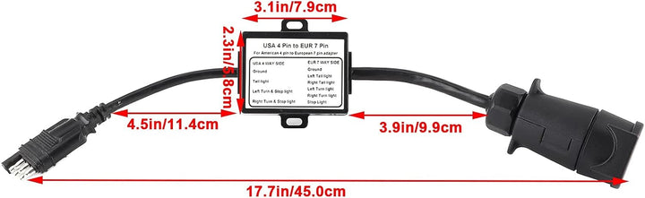 - Ideale elektrische Lösung ---- Anhänger Stecker hat sich zum Ziel gesetzt, einen amerikanischen 4-poligen Fahrzeugstecker in einen 7-poligen europäischen Adapter umzuwandeln. Ideale elektrische Lösung zum Ziehen von US-Fahrzeugen mit 4-Wege-Flat und europäischem Anhänger mit einem 7-Wege-Rundstift.