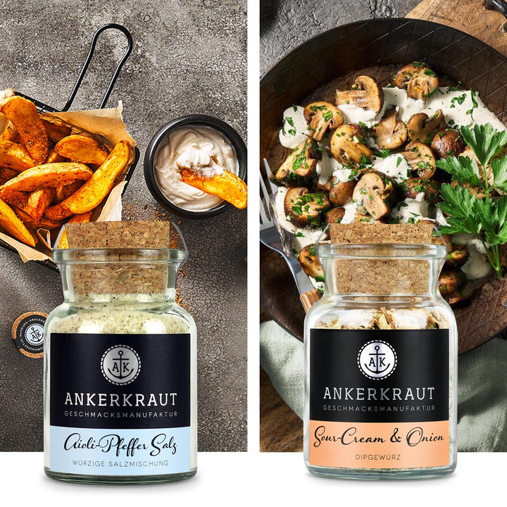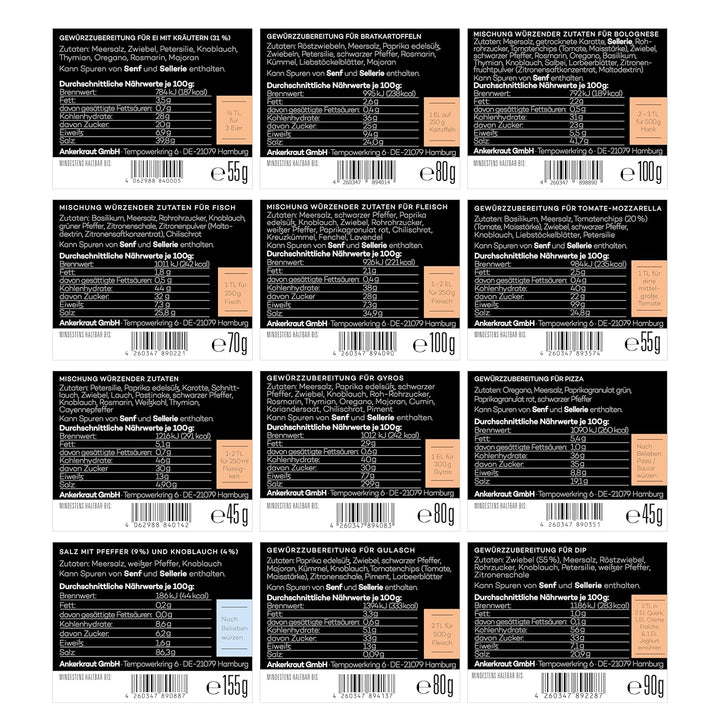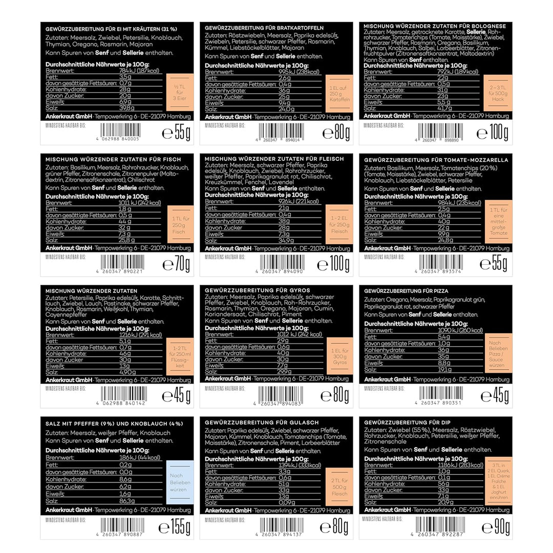 - [INHALT] im Set enthalten sind: Rührei Kräuter, Bratkartoffel, Bolognese, Fisch & Scampi, Steak, Tomate-Mozzarella, Omas Liebling, Gyros, Pizza, Aioli-Pfeffer-Salz, Gulasch und Sour-Cream & Onion.