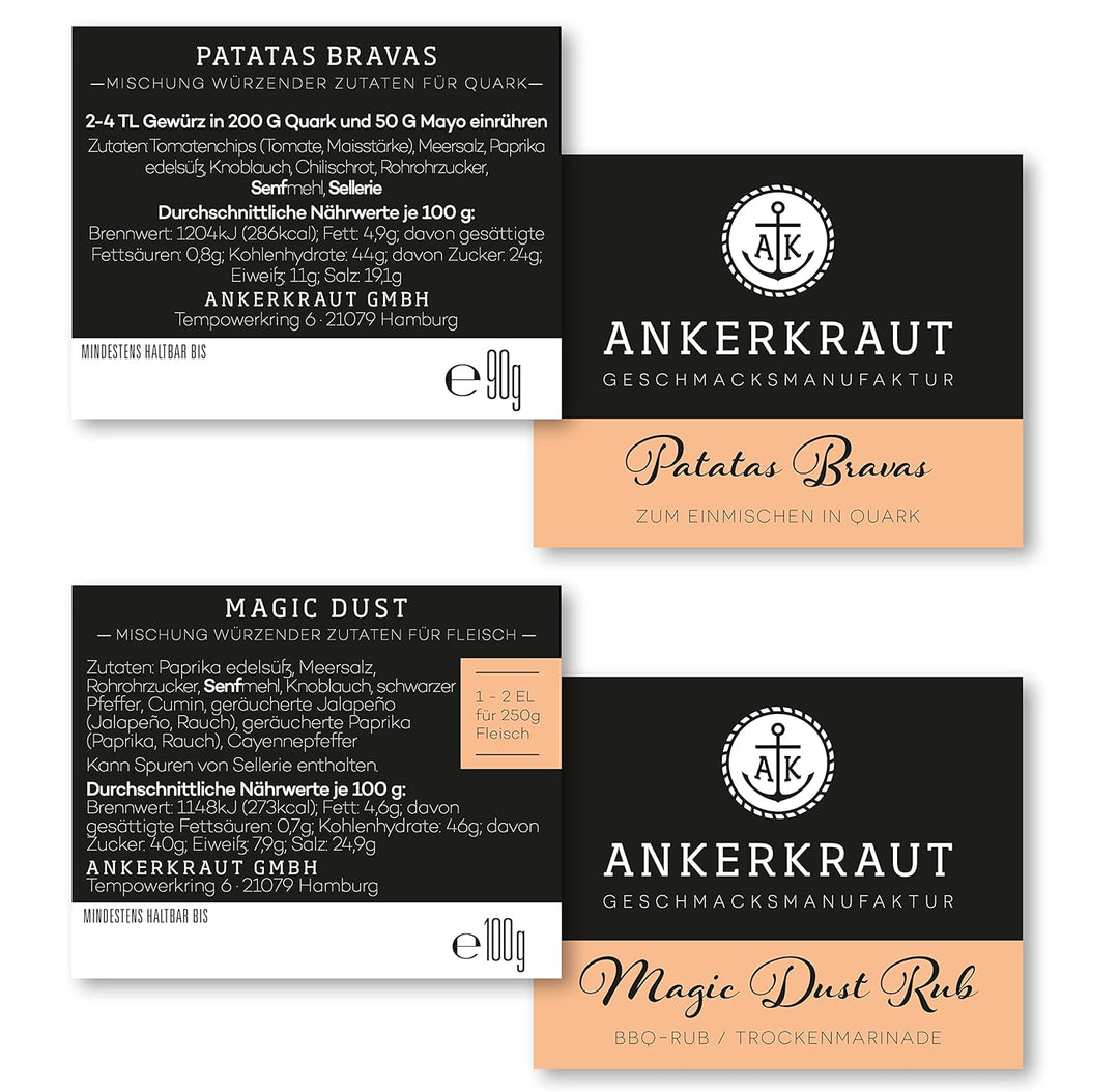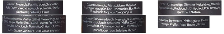 • [PRODUKT] Enthalten sind 6 Korkengläser: "Magic Dust", "Patatas Bravas", "Pfeffer Symphonie", "Steakpfeffer Hamburg", "Kräuterbutter Gewürz", "Gewürzsalz"