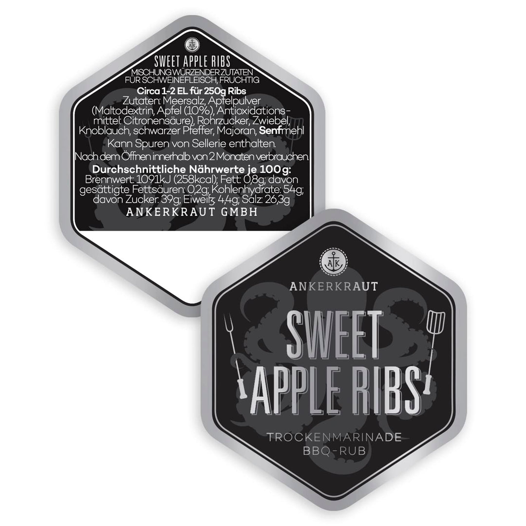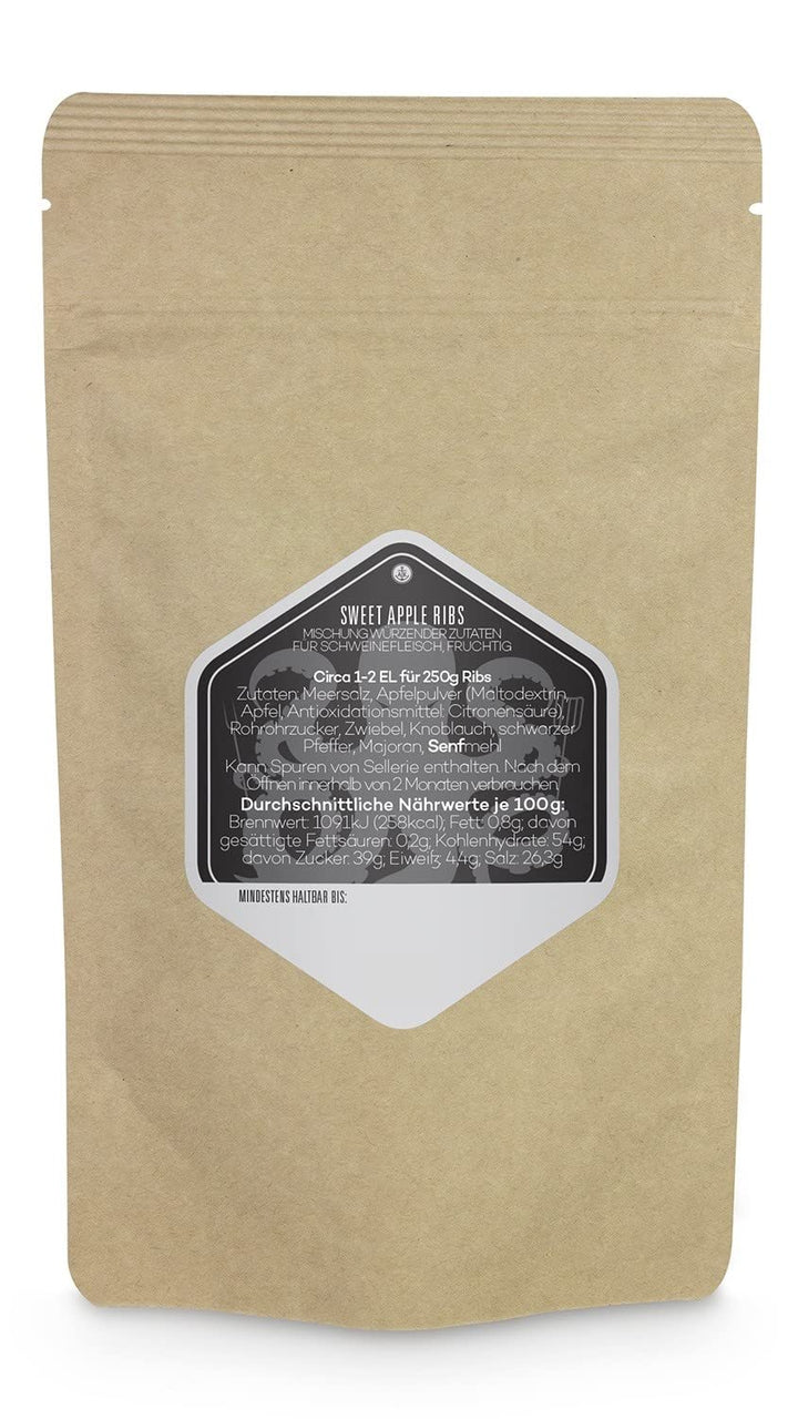 - [GESCHMACK] Die sweet Apple Ribs Gewürzmischung ist eine süsslich-fruchtige Trockenmarinade; Dabei sorgen gleichzeitig rauchig-herbe Note sorgt für das gewisse Etwas sorgt; Diese Gewürzmischung passt perfekt zu Beef Ribs, aber auch zu Flanksteak oder