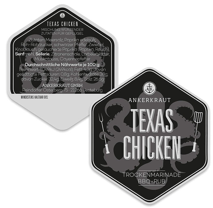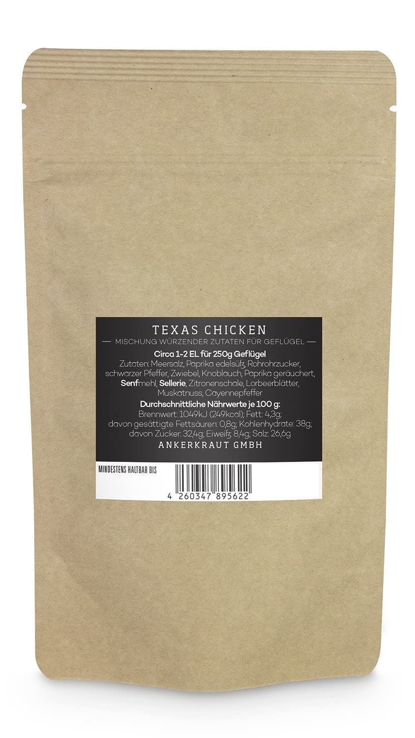 - [BESTE QULITÄT] Ohne Geschmacksverstärker und künstliche Farbstoffe; Die Zutaten werden frisch bezogen, in die aromadichten Ankerkraut Beutel umgefüllt und nach sehr kurzer Lagerzeit an die Kunden versandt; 1x 750g Texas Chicken Gewürzmischung im