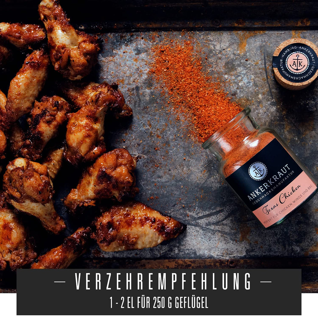 - [ANWENDUNG] Ran an den Grill - egal ob an den Gas- oder Holzkohle-Grill; Der Ankerkraut Texas Chicken BBQ-Rub ist perfekt für Chicken Wings oder auch ganze Hähnchen; Nicht nur zum Grillen, sondern auch Braten und Marinieren von Hähnchenbrust, die